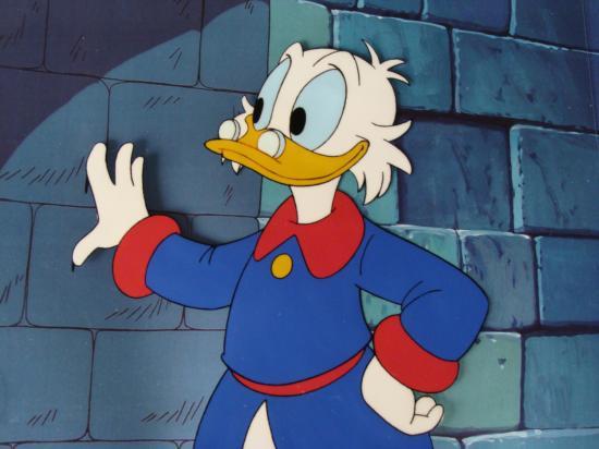Walt Disney's DuckTales was the first daily animated cartoon show to air weekdays on the Disney Afternoon. DuckTales debuted in 1988. The 1988 - 1989 season consisted of 65 episodes. The next season (1989 - 1990) included an additional 35 episodes, totaling 100. DuckTales is an extremely unique and original cartoon. Episodes such as "Sweet Duck of Youth," "Dr Jekyll and Mr. McDuck," "The Golden Fleecing" and many more play off of legends, literature, and actual historic events. Disney's DuckTales also uses clever "duck" names for characters, as well as creatively used puns to add life to this excellent show. There is a drawing overlay that is on top of the cel. Production cel: A hand-painted animation cel that was actually used to create one frame of an animated scene that appeared in a cartoon. Here, Scrooge McDuck is locating one of his secret passage ways.Original Production Cel Art with Background Copy Overall Size of the Cel: 9" x 10 3/8" Overall Size of the Drawing: 9 1/2" x 10 1/2" Overall Size of Background: 10" x 14"© Disney Walt Disney Television Animation Art sealExcellent Condition Traditional animation is a multi-step process which includes various types of art techniques. Drawings are a key part of the process, in which the animator creates the design and movement of the characters. Drawings are then transferred onto acetate cels (by hand-inking and/or photo copying) to create a production cel, which is then hand-painted on the back side, using paint colors chosen and approved by the creators of the series.The background and cel are ready to trimmed, matted, and framed. The animator's notations are shown at the top of the drawing (in Korean and English), background, and cel.