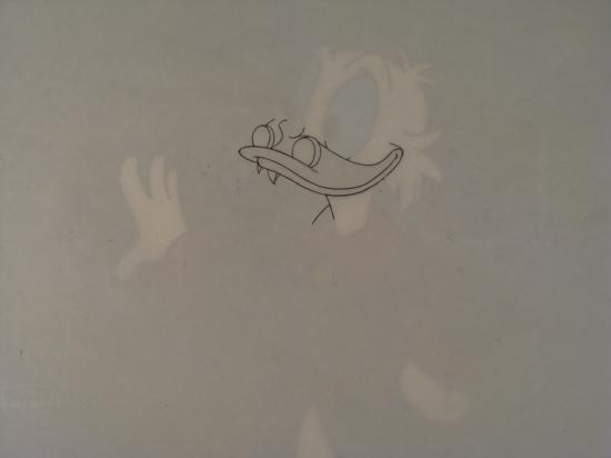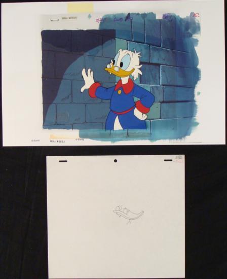 Walt Disney's DuckTales was the first daily animated cartoon show to air weekdays on the Disney Afternoon. DuckTales debuted in 1988. The 1988 - 1989 season consisted of 65 episodes. The next season (1989 - 1990) included an additional 35 episodes, totaling 100. DuckTales is an extremely unique and original cartoon. Episodes such as "Sweet Duck of Youth," "Dr Jekyll and Mr. McDuck," "The Golden Fleecing" and many more play off of legends, literature, and actual historic events. Disney's DuckTales also uses clever "duck" names for characters, as well as creatively used puns to add life to this excellent show. There is a drawing overlay that is on top of the cel. Production cel: A hand-painted animation cel that was actually used to create one frame of an animated scene that appeared in a cartoon. Here, Scrooge McDuck is locating one of his secret passage ways.Original Production Cel Art with Background Copy Overall Size of the Cel: 9" x 10 3/8" Overall Size of the Drawing: 9 1/2" x 10 1/2" Overall Size of Background: 10" x 14"© Disney Walt Disney Television Animation Art sealExcellent Condition Traditional animation is a multi-step process which includes various types of art techniques. Drawings are a key part of the process, in which the animator creates the design and movement of the characters. Drawings are then transferred onto acetate cels (by hand-inking and/or photo copying) to create a production cel, which is then hand-painted on the back side, using paint colors chosen and approved by the creators of the series.The background and cel are ready to trimmed, matted, and framed. The animator's notations are shown at the top of the drawing (in Korean and English), background, and cel.