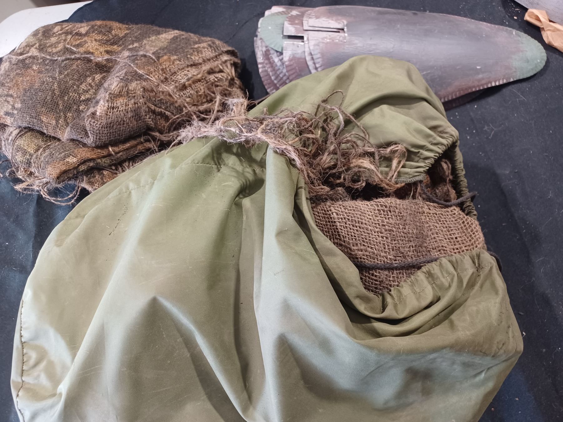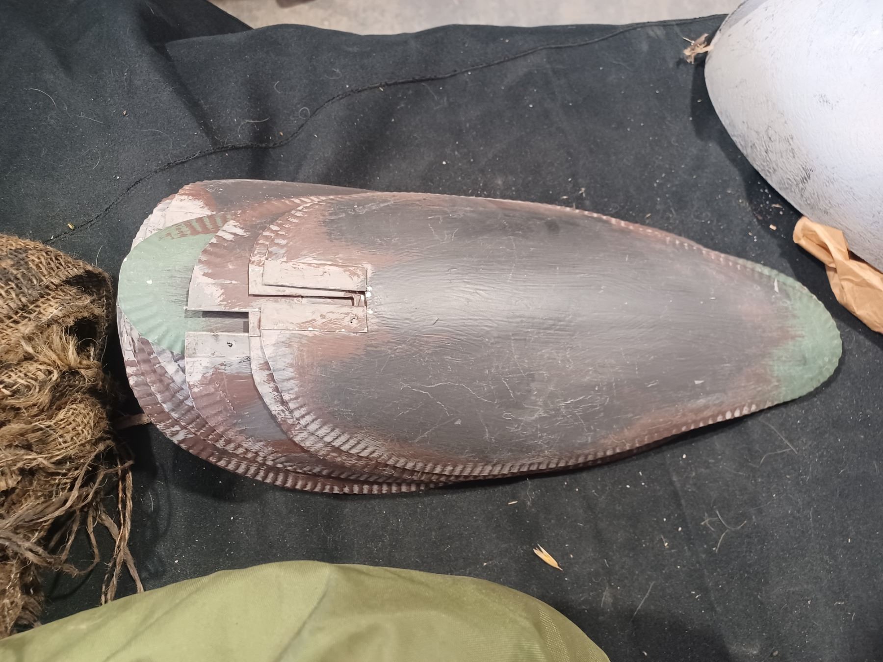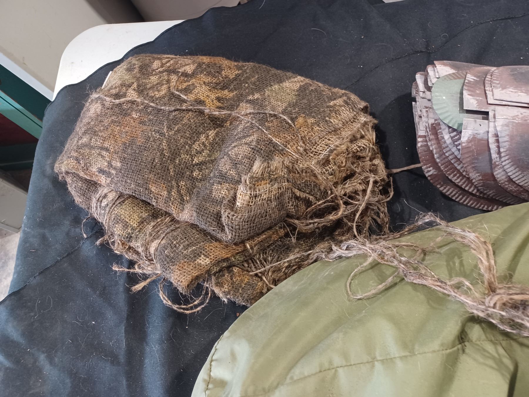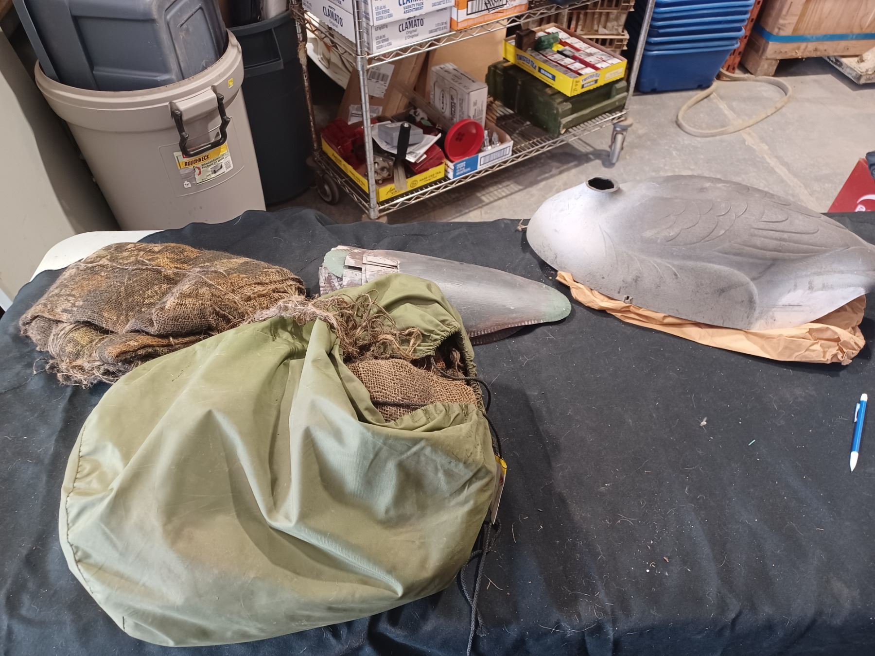 DUFFLE BAG WITH CAMO MATERIAL, TOTE WITH GOOSE/DUCK DECOYS NO HEADS