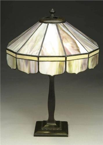 DUFFNER AND KIMBERLY LAMP. Very pretty unsigned Duffner & Kimberly table lamp has simple geometric shade of striated lavender and green glass. Leading on shade has rich brown patina with green highlights. Shade rests atop a Duffner & Kimberly base with square foot and stem leading to riser which supports a two-socket cluster attached to a heat cone. The lamp is finished with a typical Duffner heat cap with openwork hearts. Base has rich brown/green patina. SIZE: Shade is 13" dia. Overall height is 18". CONDITION: Multiple cracks to one intermediate border section, otherwise good. Base patina is good. 5-61780