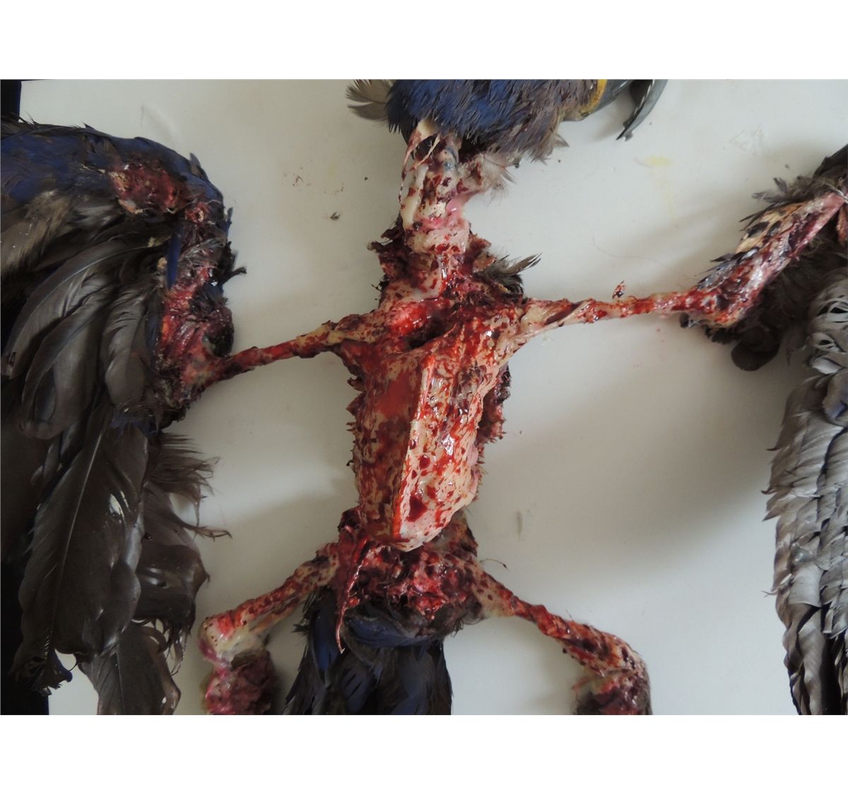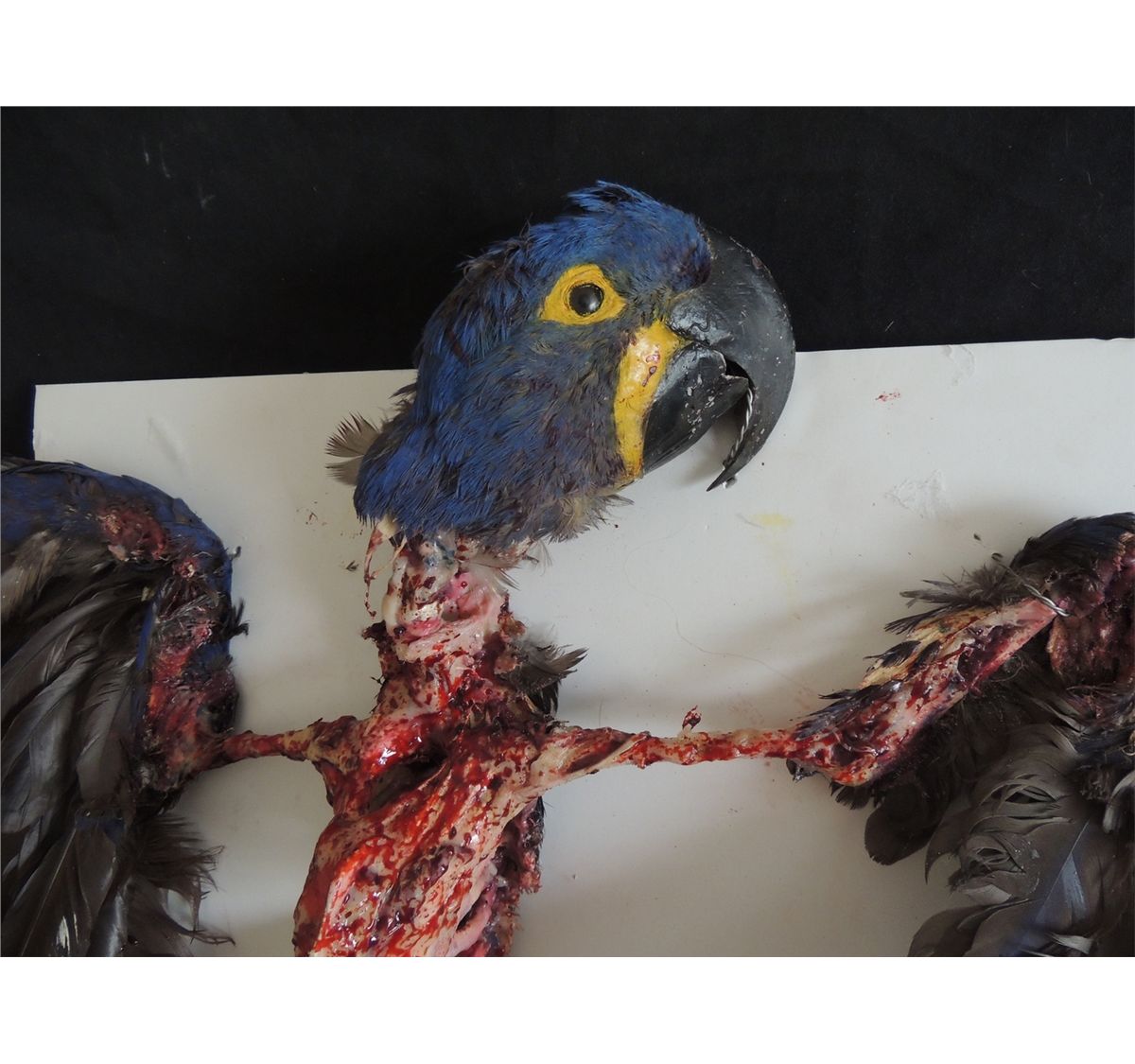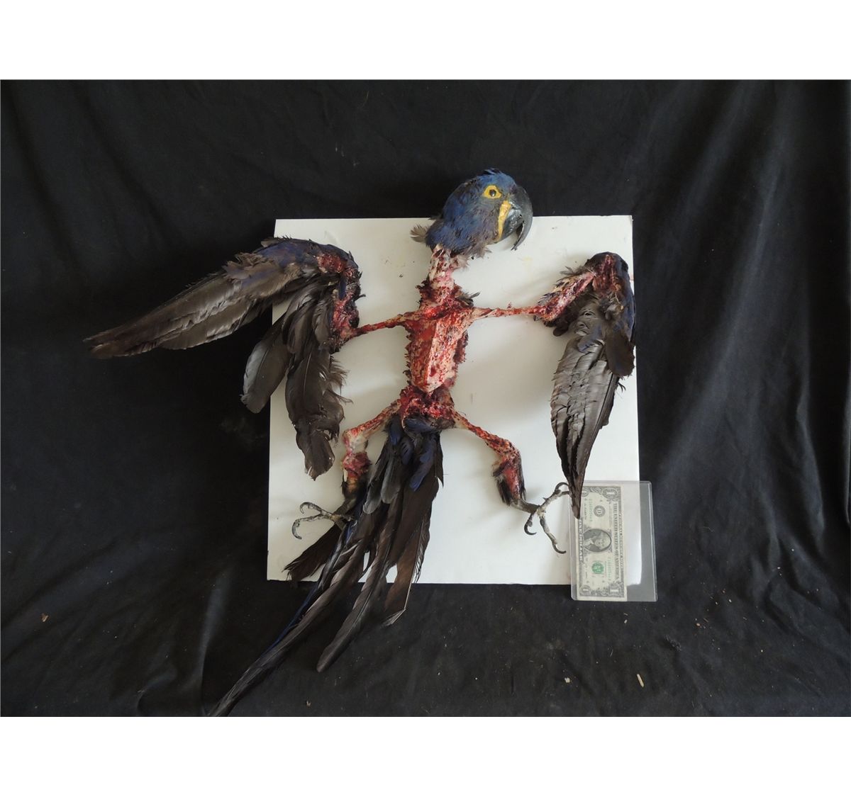This is a Macaw Parrot that gets mauled by their cat. Made from a real Macaw, but bones and gore is fabricated.