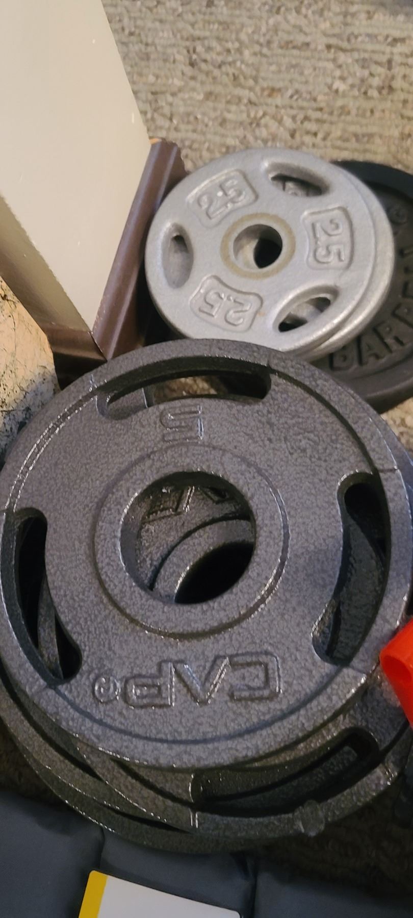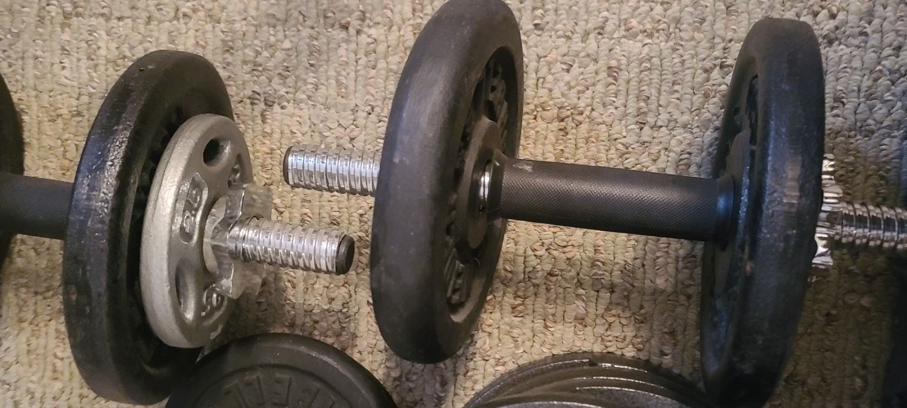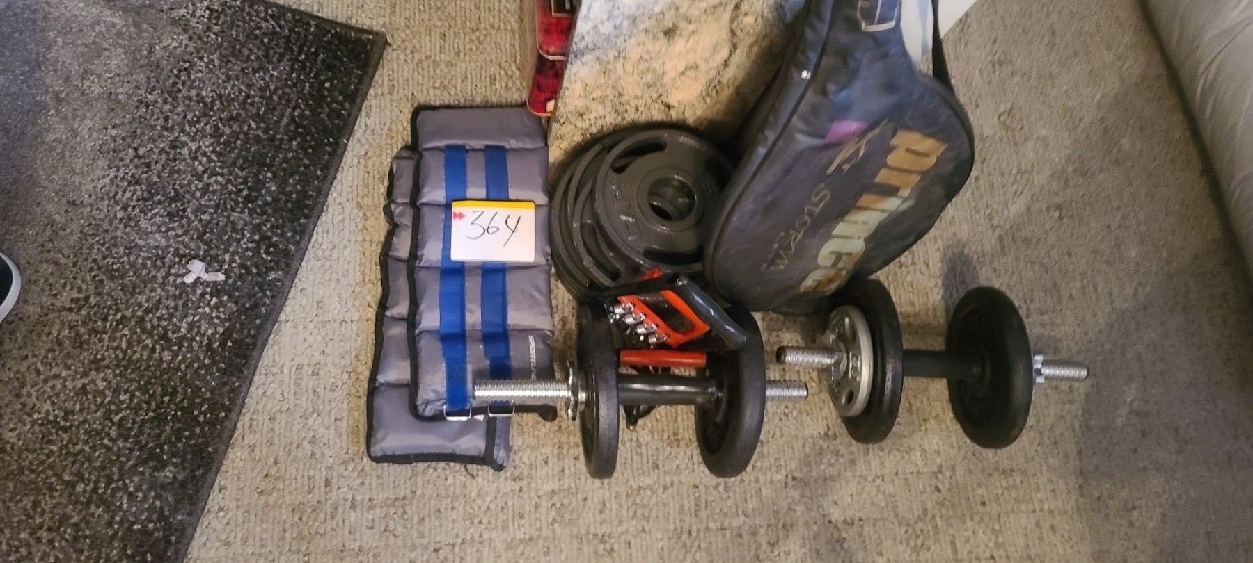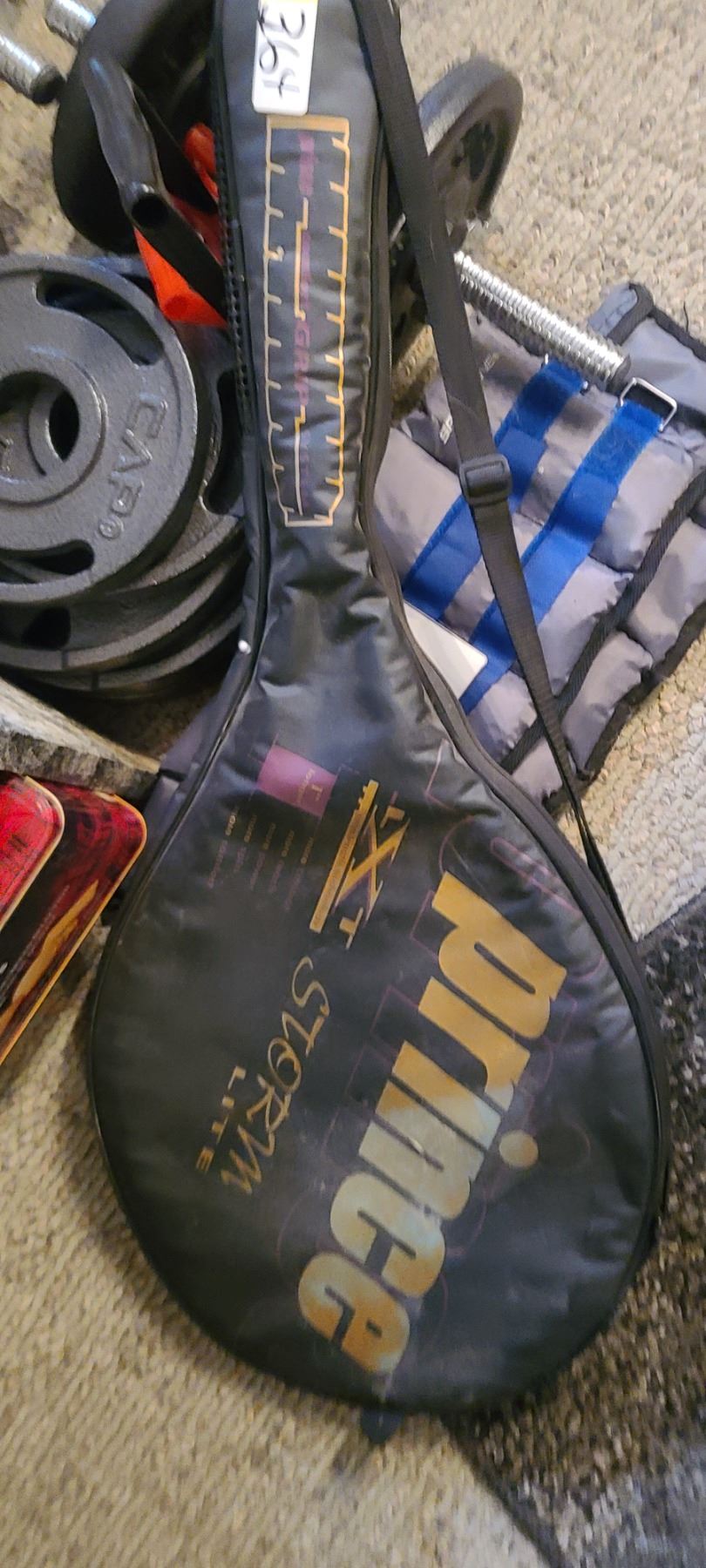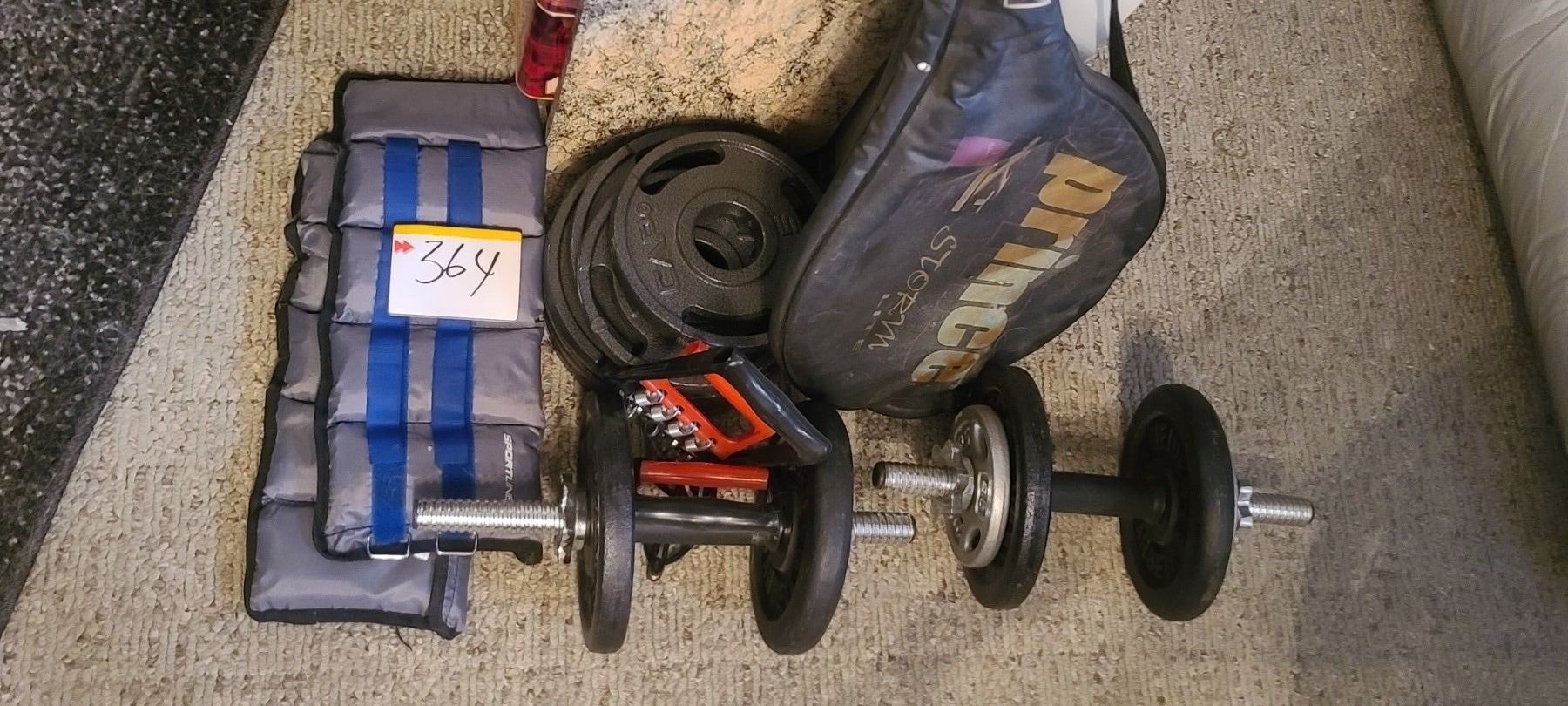 DUMB BELLS, ANKLE WEIGHTS AND TENNIS RACKET