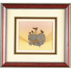 “DUMBO THE ELEPHANT” DISNEY CEL. An original hand painted production cel on rare courvoisier background from the Walt Disney 1941 production of “Dumbo”. Courvoisier backgrounds are considered rare because many were destroyed in a fire after the production of the movie. Mat is stamped with original Disney seal. Certificate of Authenticity from American Royal Arts Corp. Westbury, N.Y. SIZE: Image size: 9 3/4” w. x 8 1/4” h. CONDITION: Very good to excellent; professionally framed. PF 1-3424 (12,000-14,000)