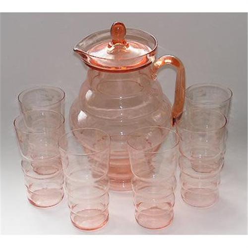 Produced by Dunbar Glass or perhaps by DC Jenkins, as the two companies made very similar Art Deco pitchers and Lemonade serving sets, during the 1930s. This 10 1/2 inch tall pink Depression Glass lidded pitcher is designed with bulbous concentric circles going from smaller circles to larger in the middle and back to smaller, creating a striking Art deco shape and adorned with a surround of wheel cut flowers around the middle. The matching set of six tumblers measure 5 ½ inches tall. The lid has a small nick under its rim - the pitcher and all six tumblers are all in excellent condition.