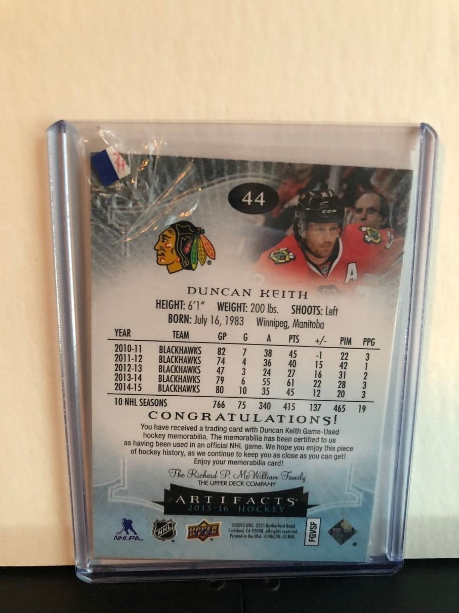 DUNCAN KEITH 2015-16 ARTIFACTS DUAL JERSEY CARD 012/125