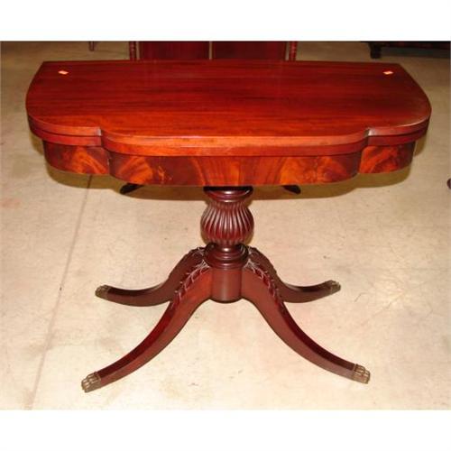 MAHOGANY DUNCAN PHYFE STYLE GAME TABLE. Carved pedestal base. 28.25” H, 36” L, 18” W (closed).