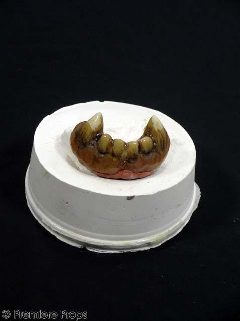 From the 2005 fantasy epic, this is a realistic recreation of a bottom set of gruesome fangs and gums screen used by a Half-Orc. The 1 1/2” tall painted and enameled fangs measure 2 1/4” across and feature caps on the incisors. The browned, decaying fangs are mounted on a white plaster mold of the actor's actual lower teeth. The fangs were cracked down center, but were repaired with dental cement. There is some light chipping on the enamel.