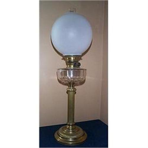 A REALLY GRAND PIECE FOR ANY HOME! THIS MAJESTIC PIECE STANDS 28.5" TALL TO THE TOP OF THE CHIMNEY. THE OPAQUE SHADE( WHICH I DON'T BELIEVE IS ORIGINAL) HAS A CIRCUMFERENCE OF 27.5". VERY FINE FLUTED BRASS COLUMN STANDS ON AN 8" CIRCULAR BASE. THE GLASS FONT IS SUPERBLY FACETED, WITH "THUMBPRINT" DECORATION ON THE UNDERSIDE. THE CLEAR GLASS CHIMNEY IS LIKELY TO BE A REPLACEMENT, AS ONE COULD EXPECT. THE ORIGINAL BRASS BURNER WITH RAISER MECHANISM AND BOTH WICK WINDERS ARE IN WORKING ORDER AND BOTH WICK WINDERS ARE MARKED "DUPLEX". THE CONDITION IS VERY GOOD; I CAN ONLY SEE A SMALL DENT TO THE BASE, PHOTOS ARE AVAILABLE UPON REQUEST. I CANNOT FIND ANY MAKERS MARKS ANYWHERE, BUT IT SURELY BEARS ALL THE ATTRIBUTES OF A HINKS LAMP. WE ARE WELL EXPERIENCED IN PACKING/SHIPPING WORLDWIDE, WHICH IS NOT EXPENSIVE FROM MONTREAL, CANADA.