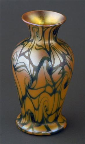 DURAND ART GLASS VASE baluster form, gold ground with green decoration, 7" high