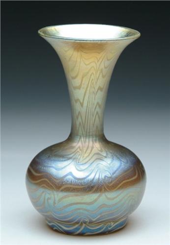 DURAND DECORATED VASE. Lovely Durand vase has white King Tut pattern against a gold iridescent background with wonderful blue iridescent highlights. Interior of vase is brilliant gold iridescence. Bottom of vase has faint remnants of Durand signature. SIZE: 6-3/4 in. t. CONDITION: Very good to excellent. 5-61038