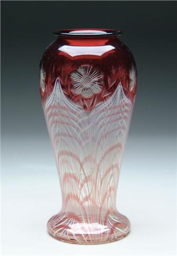 DURAND DECORATED VASE. Outstanding Durand vase has red cut to clear flowers surrounding the shoulder and topping a clear glass bottom with white and red pulled feather design. Signed on the underside in silver "Durand". SIZE: 10 in. t. CONDITION: Very good to excellent. 5-61027