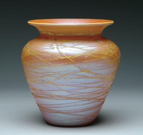 DURAND THREADED VASE. Beautiful Durand vase has gold iridescent threading against an orange/gold iridescent background. Interior of vase shades from yellow to orange iridescent at lip. Signed on underside is silver "Durand 1710-8". SIZE: 8-1/4 in. t. CONDITION: Some thread loss. 5-61043