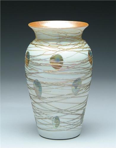 DURAND THREADED VASE. Wonderful Durand vase is decorated with gold and green iridescent leaf design in three horizontal rows encircling the vase. Vase is covered with gold iridescent threading. All decoration is against a slightly iridescent cream colored background. Interior of vase is decorated with yellow to gold iridescence. Signed on the underside "Durand 1812-8". SIZE: 7-3/4 in. t. CONDITION: Only minor loss to threading, otherwise very good to excellent. 5-61044