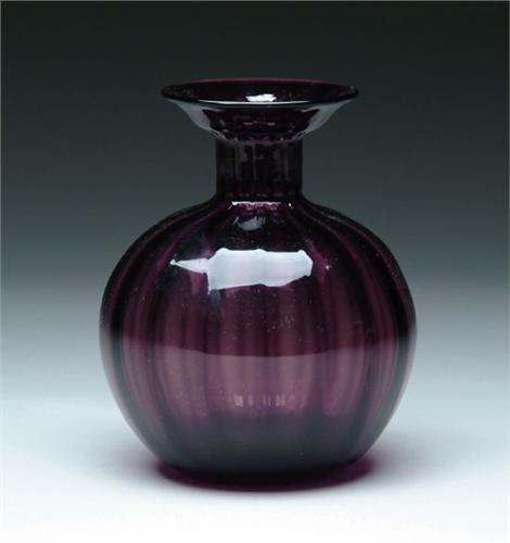 DURAND VASE. Rich amethyst vase has bulbous ribbed body with slender neck and flaring lip. Signed on underside with silver "V" mark "Durand 1987-6". SIZE: 6 in. t. CONDITION: Very good to excellent. 5-61040