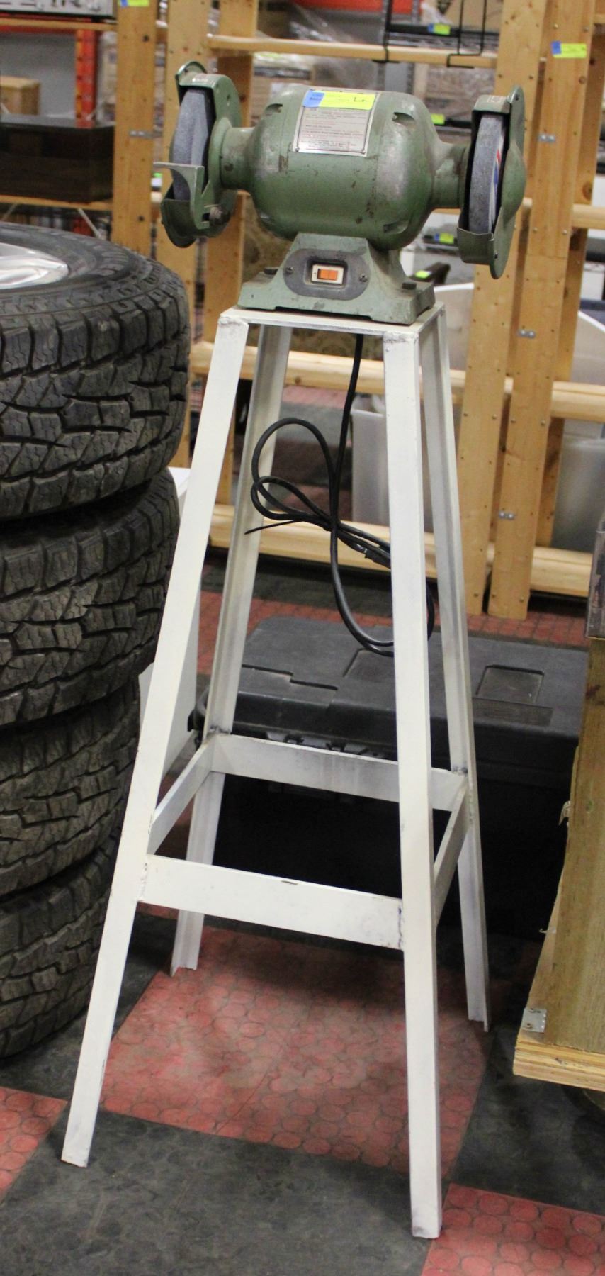 BENCH GRINDER ON CUSTOM MADE WORK STAND - 6"-WHEEL, 3500 RPM (TESTED/WORKING) **ALL ITEMS MUST BE REMOVED BY 5PM SATURDAY, MARCH 1ST 2025. ALL REMAINING ITEMS WILL BE SUBJECT TO A $6.00 PER DAY STORAGE CHARGE. ANY ITEMS REMAINING AFTER MONDAY, MARCH 17TH 2025 WILL BE CONSIDERED FORFEITED. NO REFUNDS WILL BE ISSUED FOR FORFEITED ITEMS. TO SCHEDULE A PICK UP APPOINTMENT CLICK HERE