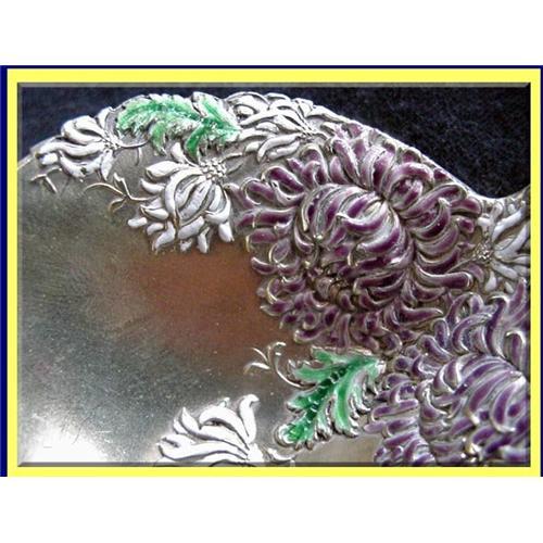 Exceptional American sterling silver ladle, made 19th century by WM. B. Durgin Co.<BR>Measures 7 5/8inches long. Bowl is 2 3/4inches accross. Weighs 5oz.<BR>Sterling silver with gold wash. Japanese and Art Nouveau influence seen in the raised, enameled Chrysanthemums. Enameling in green, purple and white of exceptional quality. Very fine detai. Back of handle has similar raised Chrysanthemums, with gold finish.<BR>Tear-shaped reserve on handle for initials has been left empty. <BR>Marked on the back with D Durgin mark; STERLING 925/1000 PATENT.<BR>Condition is very good. No damage of any sort.