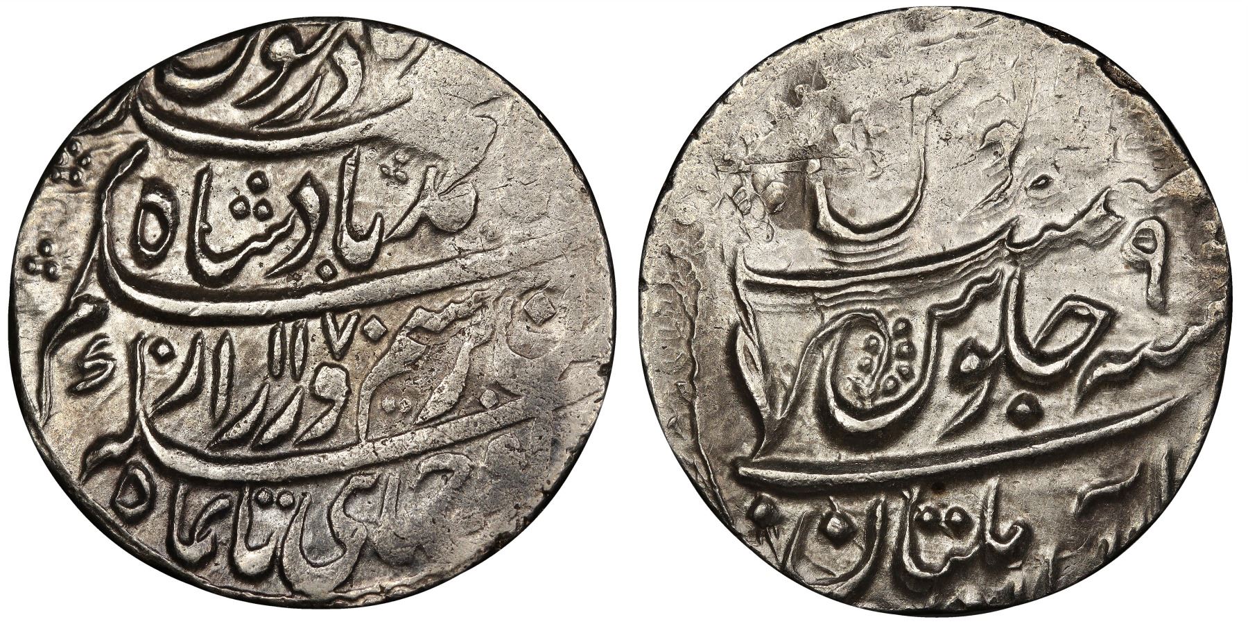 DURRANI: Ahmad Shah Durrani (1747-1772), AR Rupee (11.51g), Multan, AH 1170, RY 9. Mint name with epithet "Dar Al-Iman" (the dwelling of faith). KM--- (unpublished). Extremely fine. Unpublished date, of the highest rarity.