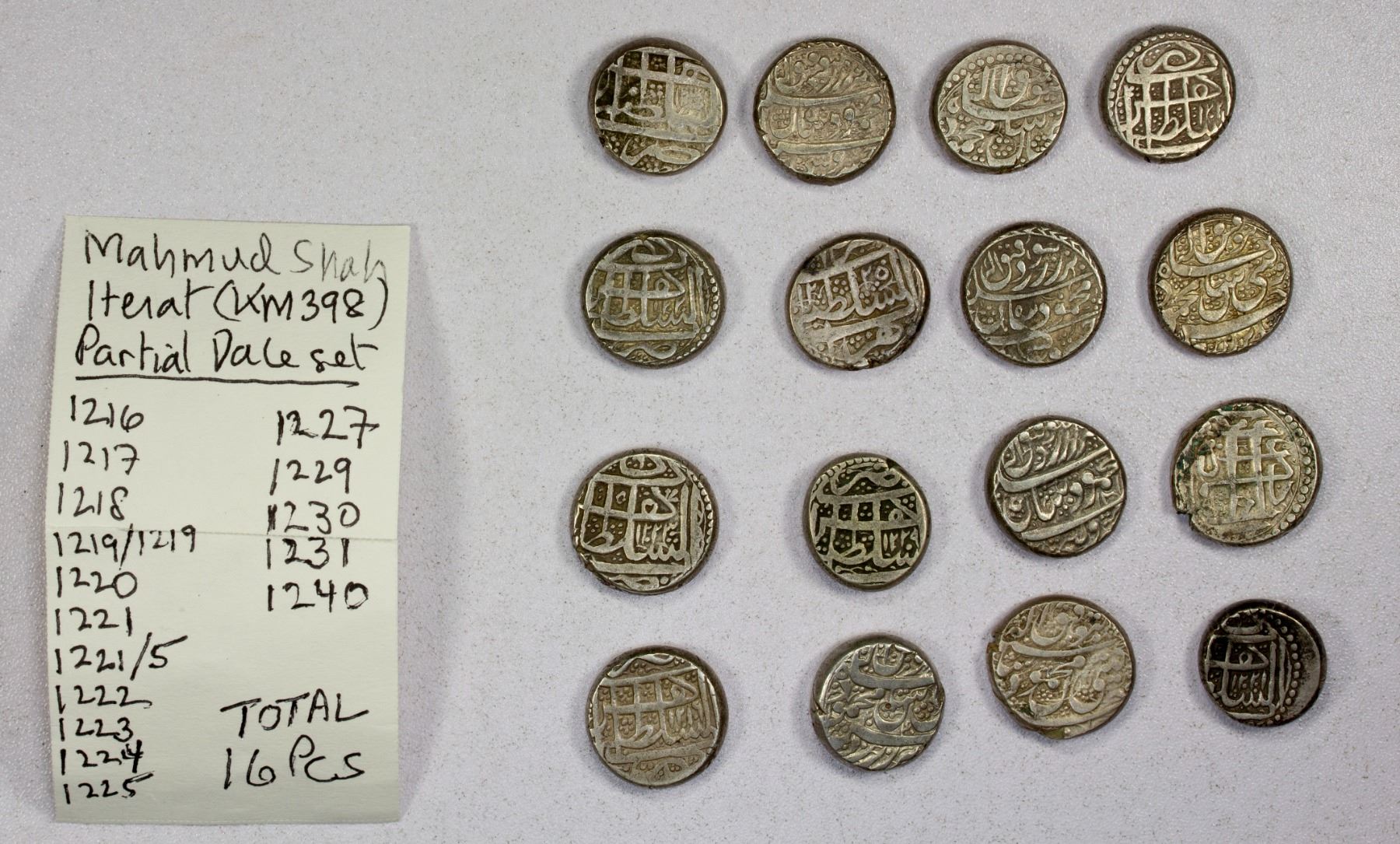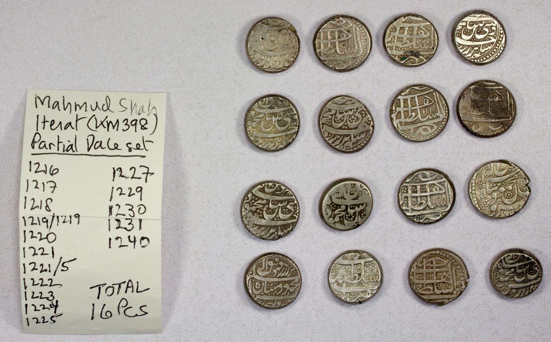 DURRANI: SET of 16 silver rupees, including types A-3138.1, dates AH1216, 1217, 1218, 1219, 1220, 1221 (2 pcs, one with regnal year 5 added), 1222, 1223, 1224, 1225, 1227, 1229, 1230, and 1231, also A-3138.2, AH1240; pleasant strikes and nearly all VF, dates provided by the consignor; retail value $525, lot of 16 pieces.