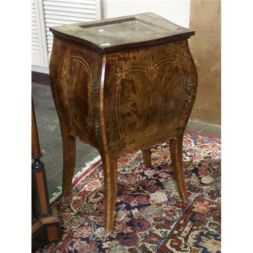 NIGHTSTAND: Dutch Baroque style walnut bombe shape nightstand, marquetry inlay, no marble top, note scratches, nicks and loss of finish. 30''h x 14''d x 18''w