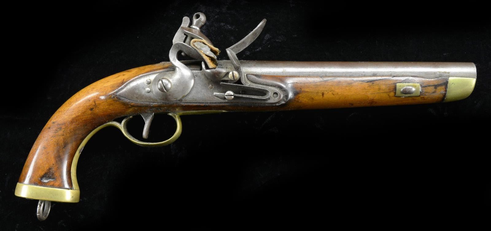 Cal. 69. NSN. Mfg. in Liege w/ 9" smoothbore bbl. Lock is stamped "crown / DM" indicating Delft, Netherlands Arsenal. Wedge fastened walnut stock w/ lanyard ring at butt. Brass nose cap, trigger guard, butt & 1 wedge escutcheon; other escutcheon appears German silver. CONDITION: good overall. Gray patina metal having light pitted appearance. Stock has numerous deep marks w/ wood grain checks & lg. cracks. Good bore appears lightly pitted. (01-20678/MD). ANTIQUE. $300-500.