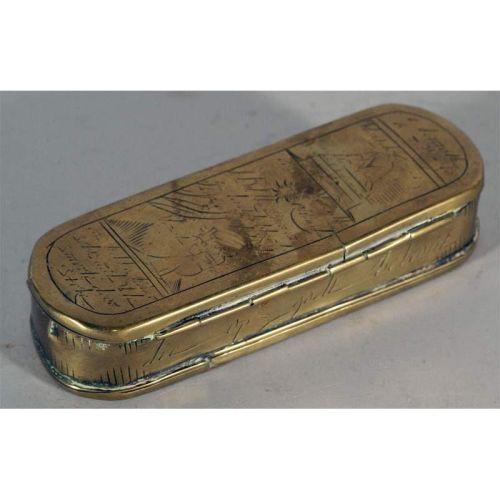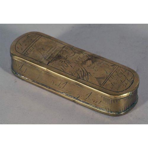 DUTCH BRASS TOBACCO BOX, 18th century, CONDITION REPORT: a couple of small breaks on edge of lid. PACKING AND SHIPPING: We offer packing (double boxed in most cases) and shipping of this item within the Continental United States by USPS or UPS (our choice- boxes over 30lbs or oversized may be recalculated based on buyer's location), NOT INCLUDING INSURANCE (it will be added when we know the sales price) for $20
