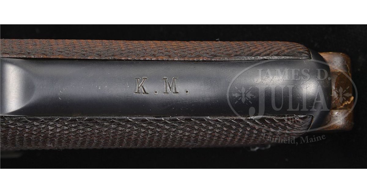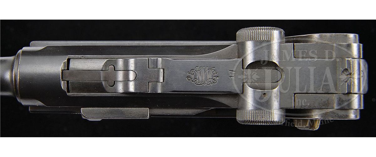 SN 117. 4" 9mm bbl. "DWM" scroll on center toggle link. Crown/N proofed. "RUST" safety marked with safety in lower position, opposite of Dutch army pistols. "Geladen" marked extractor on both sides. Checkered walnut grips. "K.M." on front gripstrap. One of 1484 P.08s purchased by the Dutch Navy and delivered in 1928 – 30, the last contract pistols made by DWM/BKIW. All numbered parts on the gun are matching except for the grips which do not match. Wood bottom magazine is numbered but does not match. This gun is featured on p. 560 of Dr. Geoffrey Sturgess' The Borchardt & Luger Automatic Pistols. PROVENANCE: Collection of Dr. Geoffrey Sturgess, ex-Visser collection. CONDITION: Excellent retaining 97% original blue and 95% original straw. Bore is bright with light wear. Grips are worn with some chips and indents in checkering. Wood bottom magazine has a crack through the wood bottom but is otherwise excellent. Mechanics are sound. 4-52884 BWS54