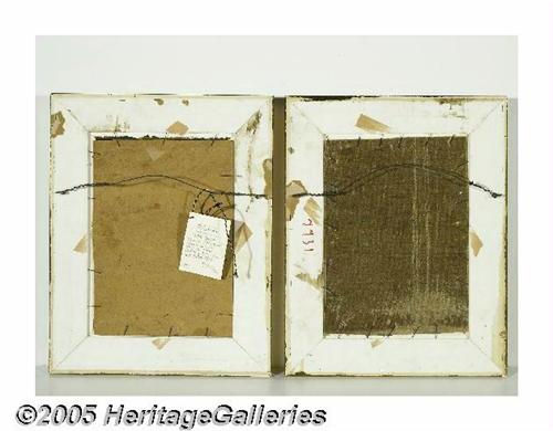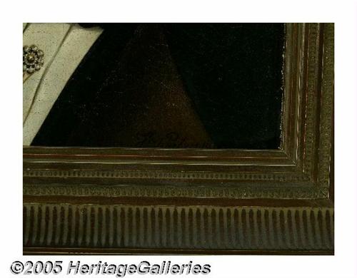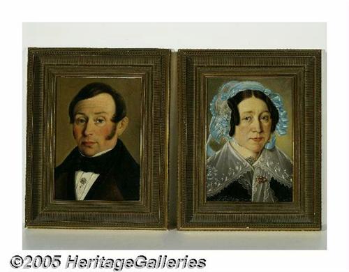 <B>DUTCH SCHOOL (19th Century)</B></I><BR>Portrait of a Man and Woman (pair)<BR>Oil on canvas laid down on board<BR>13.25in. x 9.25in.<BR>Signed 'T.J. Pieters, 1840'<BR><BR>Condition Report: Man: canvas laid down on board, 5in. tear across head at hairline repaired and inpainted, large curving tear on left side of canvas repaired, some overpaint in cheeks, 'P' in signature strengthened; Woman: canvas is wax-lined without backing, small tear at top of bonnet repaired<BR>