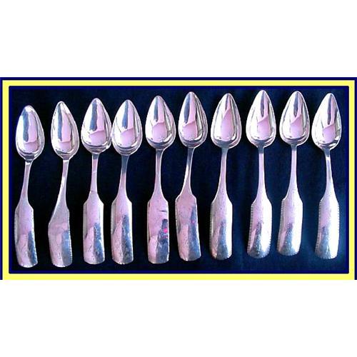 Set of 10 Dutch silver spoons for oranges fruitsalad or tea. Netherlands 1850 and 1851.<BR>Each spoon is 5inches long. The tapering stems terminate in broad bright-cut and curved terminals.<BR>Each spoon is fully hallmarked on the back with the lion silver standard mark, the profile assay mark (both used since 1814) and date and maker's marks. 5 spoons made by WC are dated 1851 with date letter R and 5 spoons, made by I over AD? with date letter Q for 1850.<BR>Great old silver patina. 2 terminals are slightly bent flat and there are some tiny splits, noticeable if you are looking for them only,otherwise very good condition for their age and delicacy.