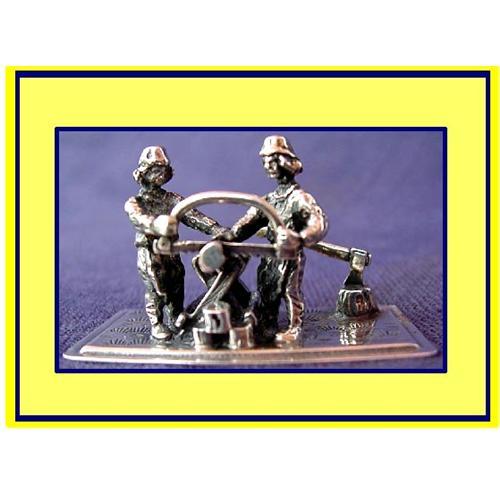 </font></strong>Silver miniature of two men sawing accros a log or pole. Complicated industrial machinery. Dutch. Probably dates to late 19th or early 20th century. base is 1 7/8inches long. Flat, rectangular base is engraved with naturalistic pattern. On it are two men, sawing through a pole/log. Surrounding them is a plethora of industrial machinery and tools. Great detail - very rare celebration of the machine world. Series of Dutch hallmarks on the base. Great condition. </font>