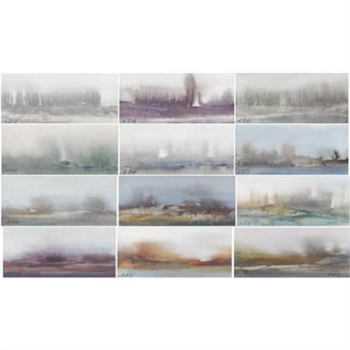 <B>Duzan Dzamonja </B></I>(b. 1928)<BR>Untitled stylized landscapes (twelve)<I>, </B></I>1988 and one dated 1986<BR>Aquarelle on paper<BR>2-1/2 x 5-1/2 inches (6.4 x 14.0 cm) (each) (sight)<BR>Initialed and dated lower left; one initialed lower right; and one unsigned<BR> <BR>Provenance: <BR>K.V. Dubinsky, Brussels<BR><BR><BR><b>Shipping:</b> Requires 3rd Party Shipping (<a target="_blank" href="http://www.heritageauctions.com/common/shipping.php">view shipping information</a>)