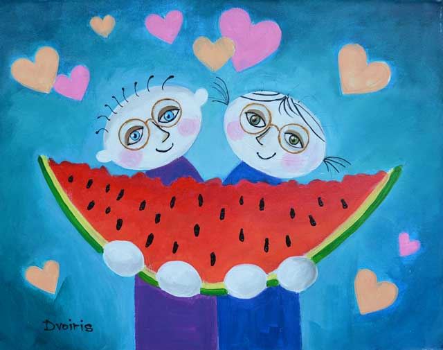Artist: Yulia Dvoiris - Title: Watermelon Twins - Medium: Original Acrylic on Canvas - Signature: This one-of-a-kind work is hand-signed by the artist at the bottom of the image - Image Size: Approximately 16 inches x 20 inches - Framed: Stretched and Ready to Hang or Frame - Details: This work comes with a Certificate of Authenticity - Biography: Yulia Dvoiris was born in 1958 in Russia, in the city of Roslavl'. - Yulia studied in the university of Art and Graphics in Magnitogorsk and worked as a book illustrator and a theatre set designer. - Yulia immigrated to Israel in 2014, where she turned to her true love for humorous paintings. -
