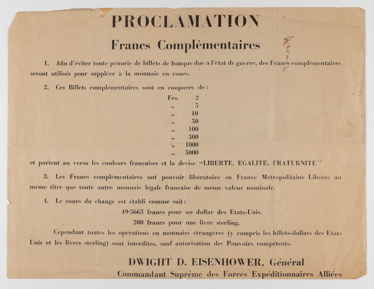 Proclamation broadside by Gen. Dwight D. Eisenhower, Supreme Allied Commander of the Allied Expeditionary Force (SHAEF) adding complementary French banknotes into circulation to prevent a shortage and stating an official exchange rate to the US Dollar and British Pound Sterling. Broadside 10 x 13 inches. Small ink inscription on verso with minor bleed through, chipped margins, folds.