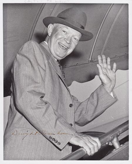 (1890 - 1969) 34th President of the United States, Supreme Commander of Allied forces in Europe during World War II and largely responsible for the successful invasion on D-Day. Fine S.P., 8" x 10" b/w, a terrific candid shot of Ike, likely as vice president, smiling and waving at the camera. Nicely signed in black ink. Fine.
