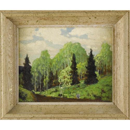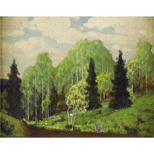 <B>DWIGHT HOLMES (1900-1986)</B></I><BR>Untitled Landscape<BR>Oil on canvasboard<BR>8in. x 10in.<BR>Signed lower left<BR><BR>A small but very well painted picture by Dwight Holmes. It retains its original artist-designed frame.<BR><BR> <B>Condition Report:</B> Good condition with minor loss to foreground. Painting would benefit from a surface cleaning. Period frame in excellent condition.<BR><BR><b>Shipping:</b> Requires 3rd Party Shipping (<a target="_blank" href="http://www.heritageauctions.com/common/shipping.php">view shipping information</a>)
