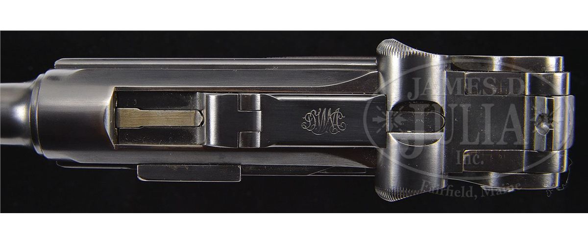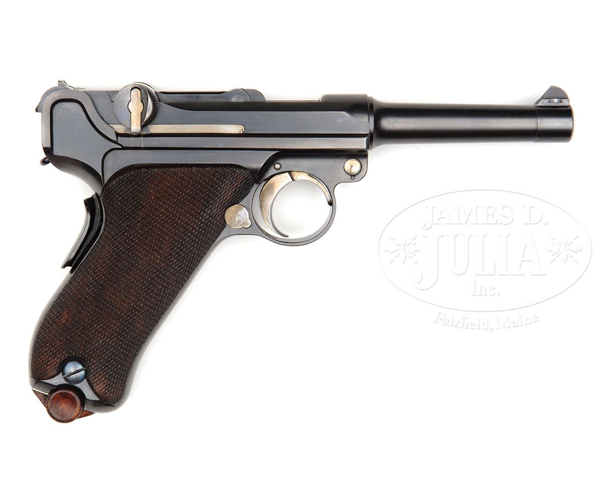SN 22727. 4" 9mm "fat barrel". "DWM" scroll on center toggle link. Dished toggles. Grip safety. Original "Cal. 9mm" marked wood bottom magazine. All numbered parts are matching down to the checkered walnut grips. "GERMANY" marked on frame underneath serial number. This gun is featured on p. 227, 273, 601, and 900 of Dr. Geoffrey Sturgess' The Borchardt & Luger Automatic Pistols. PROVENANCE: Collection of Dr. Geoffrey Sturgess. CONDITION: Excellent retaining 98% blue that was restored in the past. Retains 90% orig straw. Bore is worn with light pitting. Grips are lightly worn with very few minor chips and dings to checkering. Magazine is very nice with very little wear. Mechanics are excellent. 4-52762 BWS78
