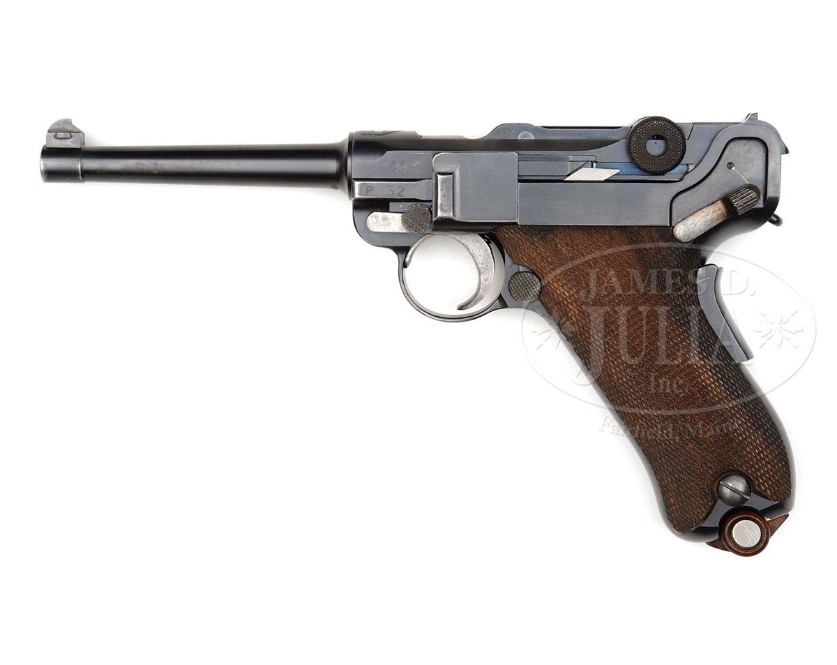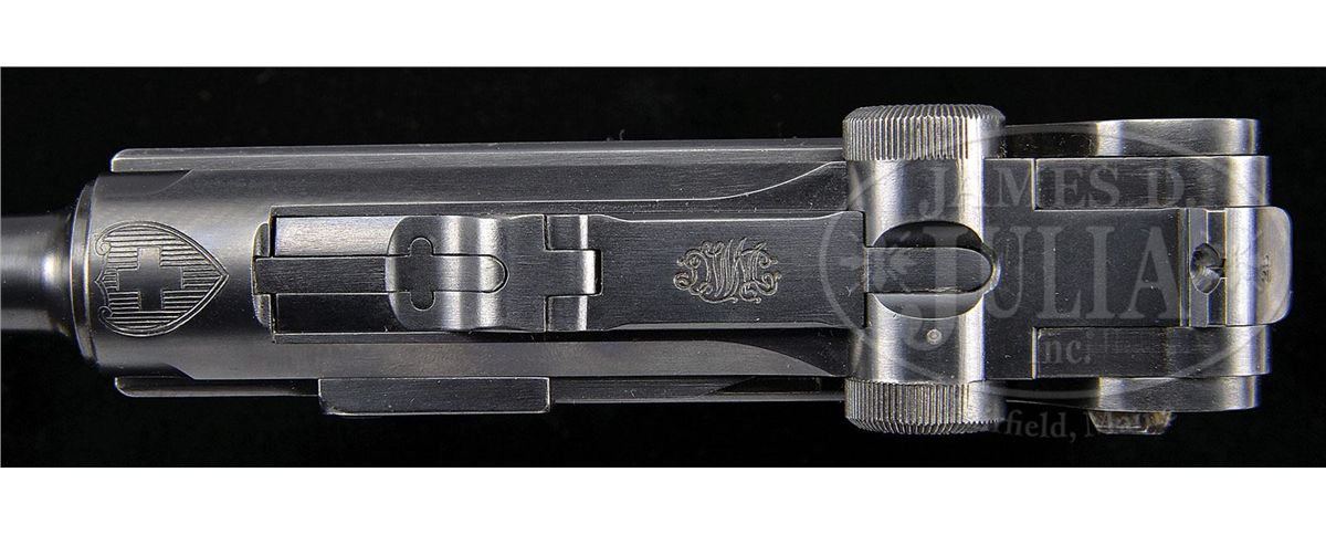 SN 14928. 4-3/4" 30 Cal. bbl. Swiss cross in shield above chamber. "DWM" scroll on center toggle link. "P 52" on left frame rail. Swiss proofs and dual +/M inspector’s marks on the left receiver. Grip safety. Checkered walnut grips. Original wood bottom Swiss magazine with circular metal disks. All numbered parts on the gun are matching. This gun is featured on p. 647 of Dr. Geoffrey Sturgess' The Borchardt & Luger Automatic Pistols. PROVENANCE: Collection of Dr. Geoffrey Sturgess. CONDITION: Excellent retaining 97% original blue and 65% original straw. Mint bore is bright and sharp. Grips are lightly worn, retain beautiful color and wood grain. Magazine and mechanics are excellent. 4-52838 BWS55
