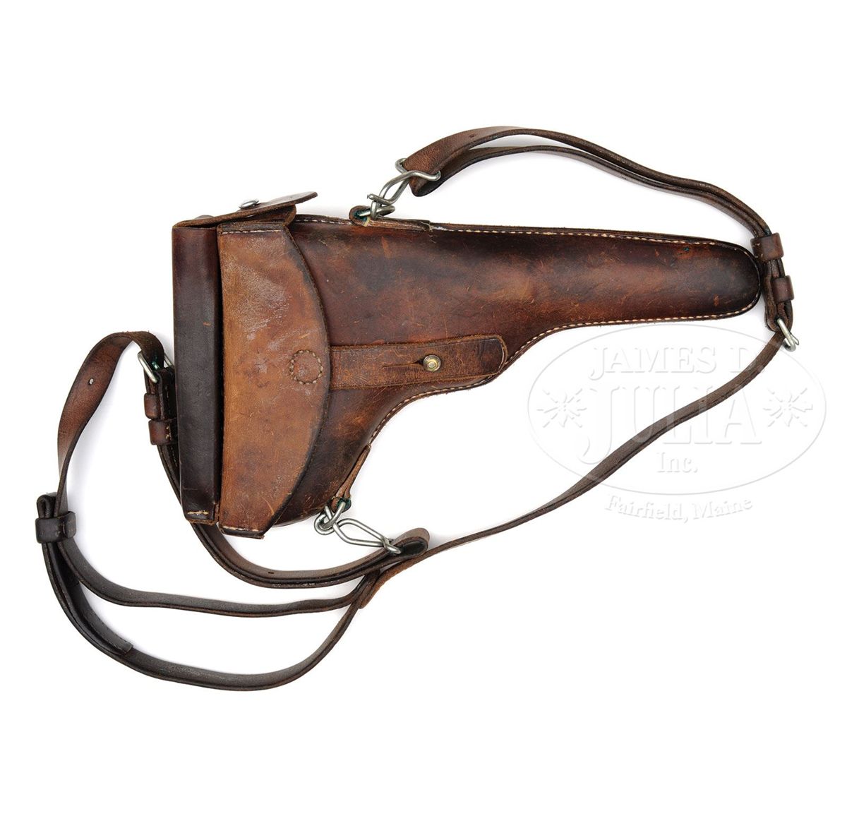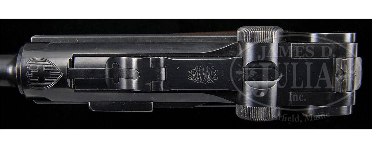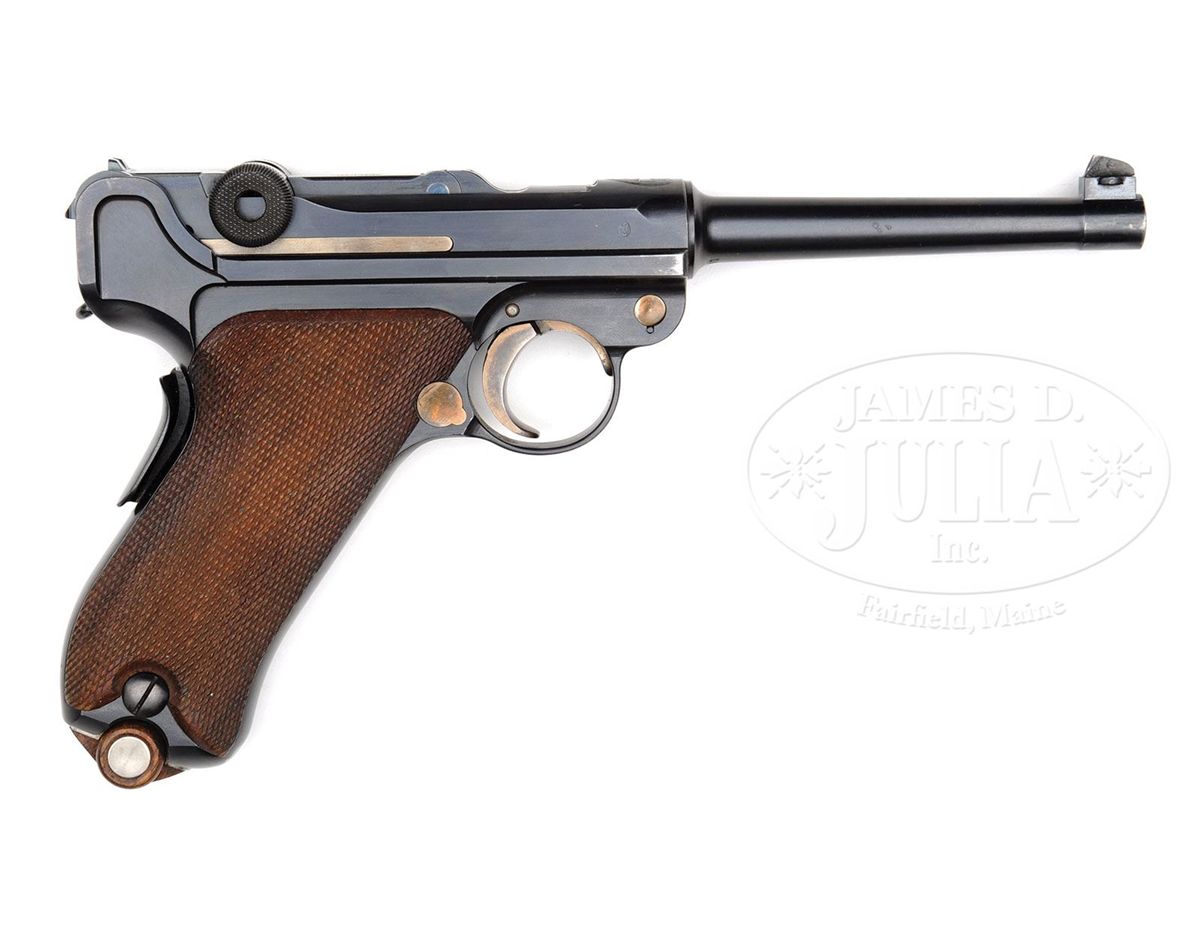 SN 14177. 4-3/4" .30 Cal bbl. Swiss Cross in Shield above chamber. "DWM" on center toggle. Swiss proofs and dual inspection marks, +/V to the left receiver and +/M to the right side as applied during the transition from Major Vogelsang to Major Muhlemann as chief inspector of the W+F in Bern. Grip safety. Checkered walnut grips. All numbered parts are matching. Proper wood bottom magazine with metal disks. With an orig Bern manufacturer marked 1923 dated brown holster with straps and an added extra magazine pouch containing another Swiss magazine. PROVENANCE: Collection of Dr. Geoffrey Sturgess. CONDITION: Excellent. Retaining 98% orig bright blue with a small holster wear spot on bottom of front grip strap. 97% orig straw. Grips are lightly worn with nice color. Magazines are excellent. Holster is very good with moderate scuffs and flaking. Mechanics are excellent. Bore is bright with light wear. 4-52837 BWS95