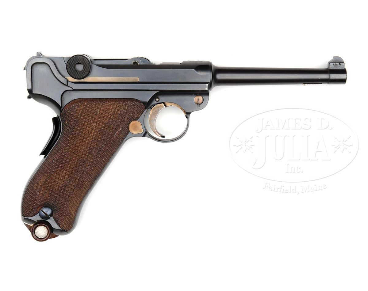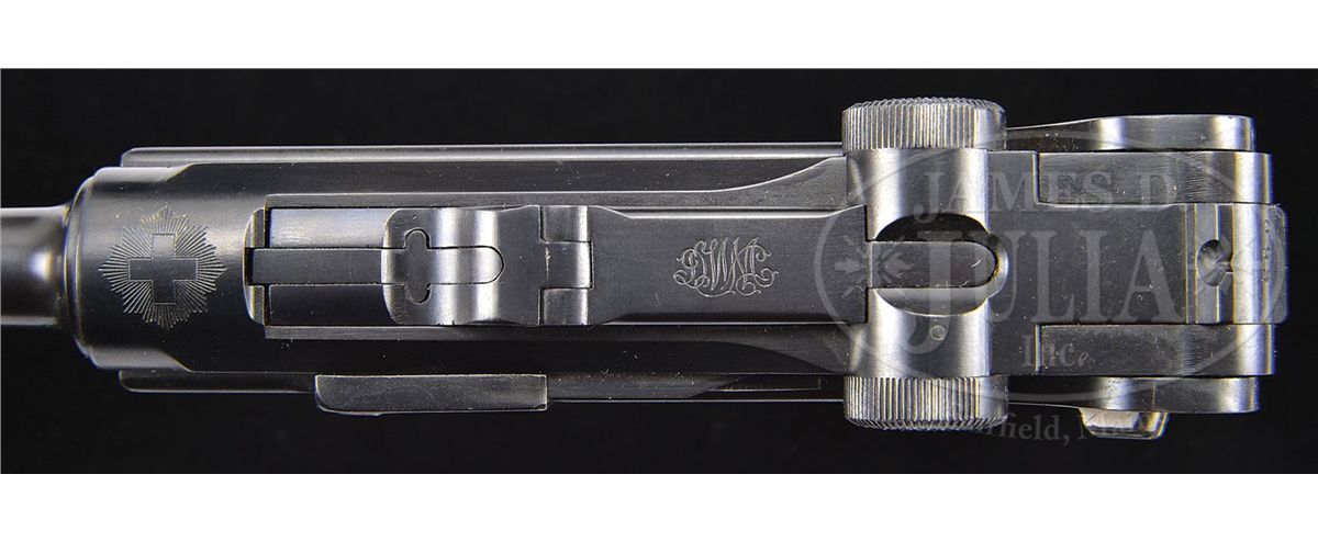 SN 29550. 4-3/4" 30 Cal. bbl. Swiss cross in sunburst above chamber. "DWM" scroll in center above toggle link. DWM Commercial range serial number applied in the large digit font typical of W+F assembled pistols and Swiss military +/V inspection and + proofs. Grip safety. Checkered walnut grips. Proper Swiss wood bottom magazine with metal disks. All numbered parts are matching. Assembled, serial numbered, and finished by W + F from DWM parts kit taken from their commercial production, probably intended as an Extra-Serie gun prior to allocation of “E” prefix numbers for the P.06. This gun is featured on p. 648 of Dr. Geoffrey Sturgess' The Borchardt & Luger Automatic Pistols. PROVENANCE: Collection of Dr. Geoffrey Sturgess. CONDITION: Excellent retaining 98% original Swiss W+F arsenal blue and 97% original Swiss arsenal straw. Mint bore is bright and sharp. Grips are sharp with light wear. Magazine is excellent with some light corrosion on the body and one small chip on the wood bottom. Mechanics are excellent. 4-52844 BWS59