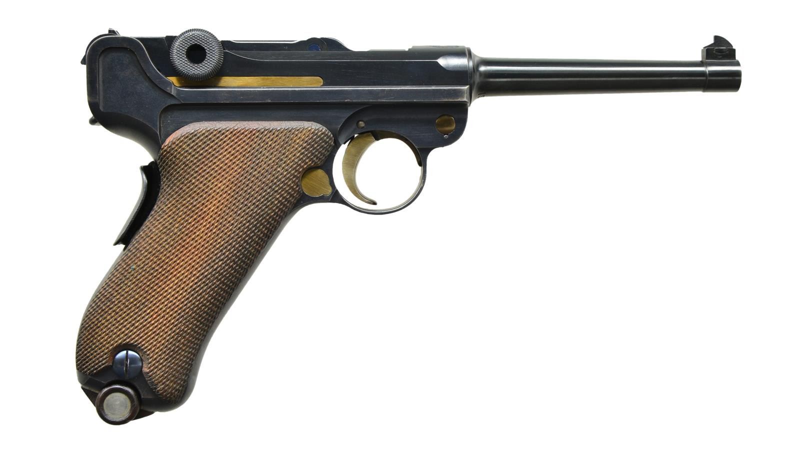 Cal. 30 Luger. S# 13225. Bbl. 4-3/4" w/ full number, sawtooth blade front sight, & Swiss cross proof. 10,215 units mfg. to include Swiss military & Swiss police. Flat checkered toggles, grip safety, strawed sm. parts & appropriate internal areas in the white. Left side of receiver w/ Swiss cross proof & boxed cross over "V". Matching numbers on trigger, grip safety, breech block, toggles, sideplate, receiver & both fully checkered walnut grips. Extractor & takedown lever not numbered. MAGS: very good correct nickel plated 8 rd. mag. w/ wrap around body & wood base. Properly unmarked & w/ disks in dimples. Slightly dull finish. UNATTACHED ACCESSORIES: good well worn brown flap holster w/ stud & strap retention. Double belt loops & D rings for shoulder strap. Spare mag. pouch on front edge. Back between loops has oval maker's mark w/ upper portion appearing to be "FRIEDLI" & lower portion ending in "BERG" plus "40" below. Scratched on back at top rear is "Lt Rcoact". Interior of holster has Swiss cross in shield at top of flap & very pronounced pistol outline to even include grip pattern. CONDITION: spectacular appearing example w/ only visible detriment being sm. amount of finish wear on high point of sideplate. Minor internal flaw pertaining trigger lever; lever looks fine but its engagement w/ trigger does not allow pistol to fire. New lever needed; or a buildup of metal on the tip that activates the sear as when lever contacts bottom of sideplate opposite end has not sufficiently moved the sear. Straw colors, Nitre blued grip screws & toggle pivots are simply astounding. Wonderful collector grade example w/ very good to excellent grips & near excellent bore to include bright muzzle. (22-4761/NW). CURIO. $1,200-1,800.