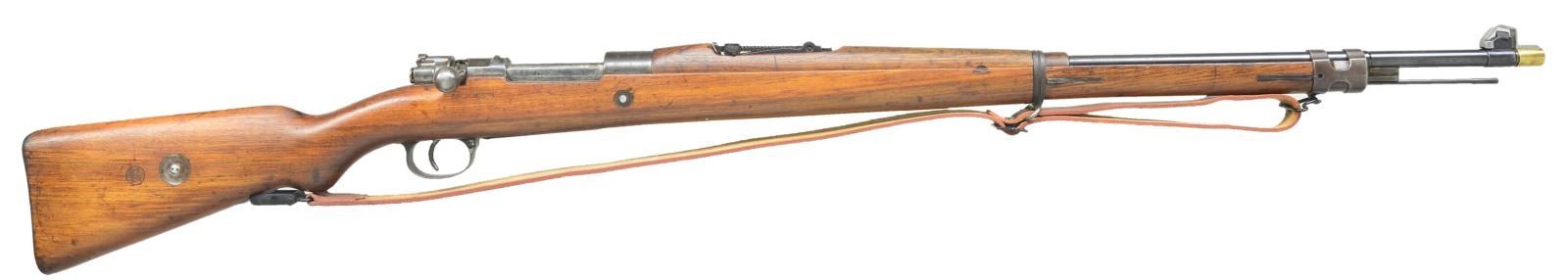 Cal. 7mm Mauser, S#B9402t. Bbl. 29 1/8" w/ import marking. Safety and bolt shroud are mismatched, all other visible numbers are matching. Receiver marked on left side rail w/ DWM address. Receiver ring marked w/ Brazilian crest and right side marked "MOD. 1908". Tangent rear sight graduated to 2000m. Inverted V front sight. Cleaning rod present. Short bayonet bar. "H" type upper band w/ parade hook. Bottom mounted sling swivels w/ reproduction leather sling. Walnut stock set. Stock marked w/ B inside encircled 6 pointed star. UNATTACHED ACCESSORIES: brass muzzle cover. CONDITION: stock set appears cleaned w/ scattered dings, scratches & handling marks. Bright receiver & bolt turning to dark patina w/ oxidation & scratches. Balance of metal parts retain 75% original blue w/ light freckling & fading on front band. Bolt release shows generous traces of fire blue. Worn bore w/ scattered frosting & pitting. (22-2394/MJC). CURIO. $400-600.