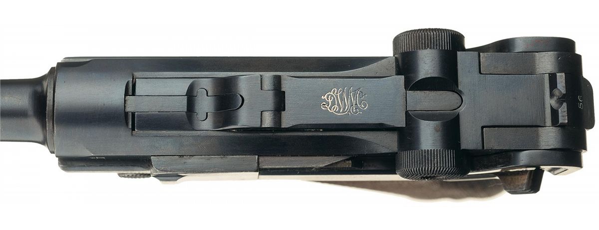 The top of the chamber is blank, the toggle has the "DWM" monogram, "crown/N" proof on the left side of the barrel extension, breechblock, toggle and underside of the barrel. There is an Imperial eagle on the front of the trigger guard. The matching serial number is marked on the front of the frame and underside of the barrel, while the partial number "56" is marked on the takedown lever, side plate and rear toggle. Straw colored small parts, fixed sights, unmarked nickel magazine with crown over Gothic letter marked wooden base and fitted with checkered walnut grips.
