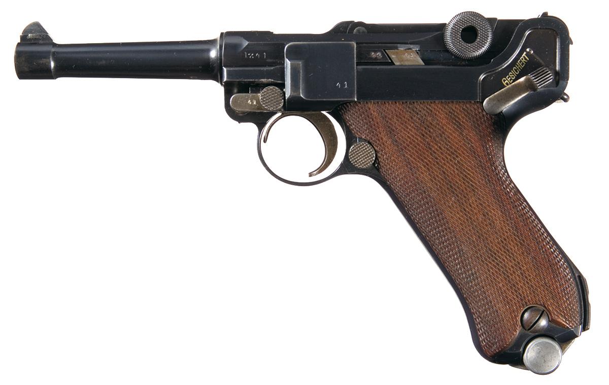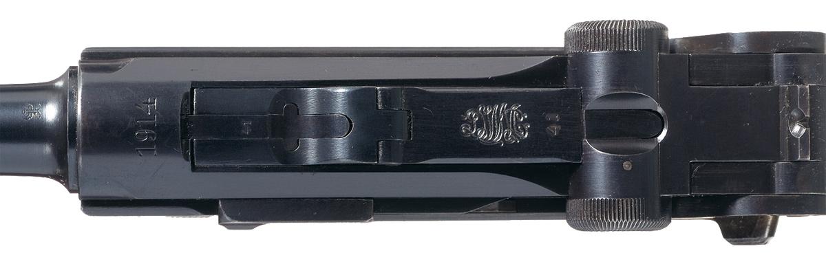 Fixed sights, with 1914 dated chamber and "DWM" logo on the toggle. The right side of the extension has the three "crown/ script letter" proofs, with the Imperial Eagle firing proof on the extension, barrel and breechblock. Matching partial numbers on the latch, side plate, sear, safety, trigger, hold-open, toggle links, extractor, breechblock and firing pin. Trigger spring absent. Checkered grips, with a World War II blue finished aluminum base replacement magazine.
