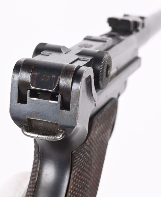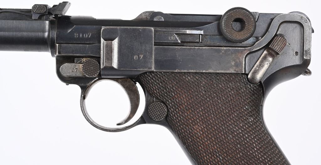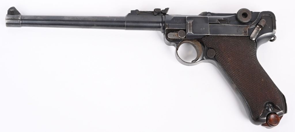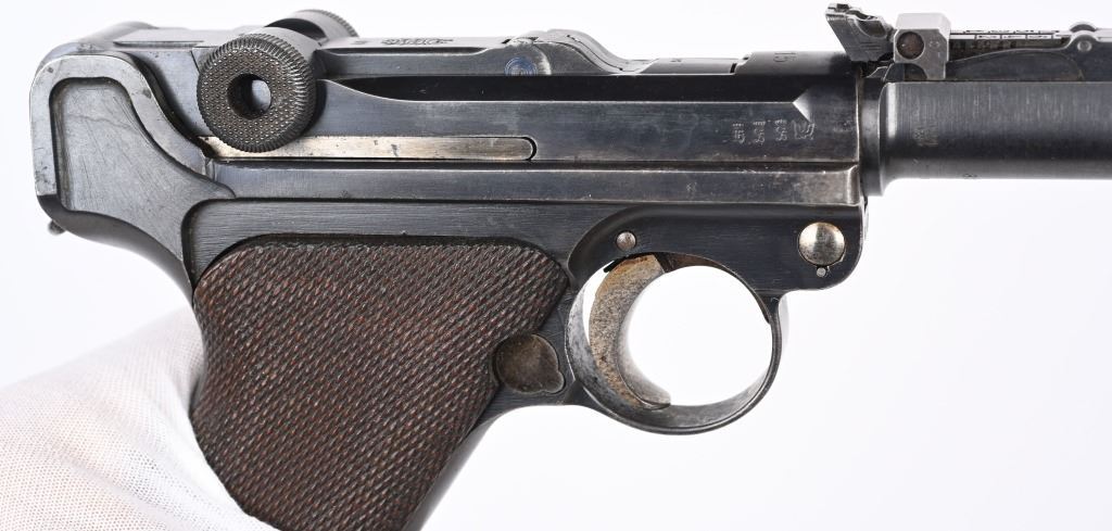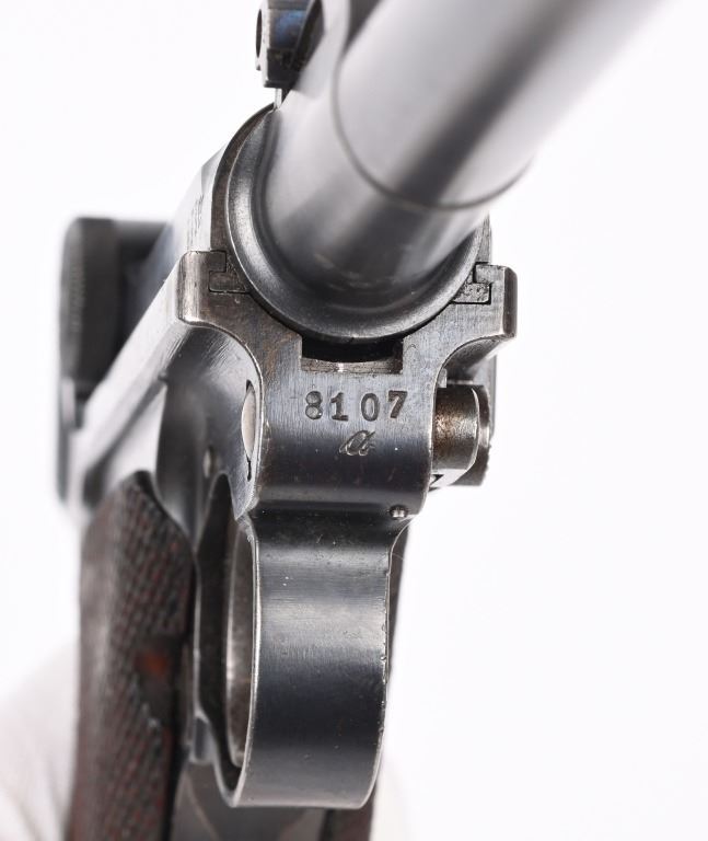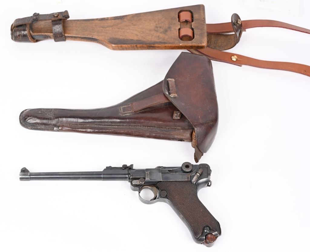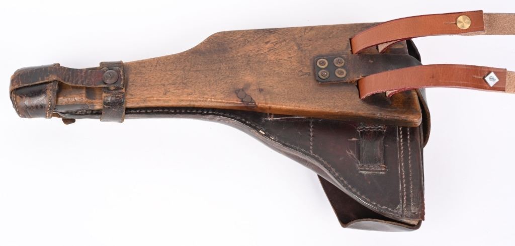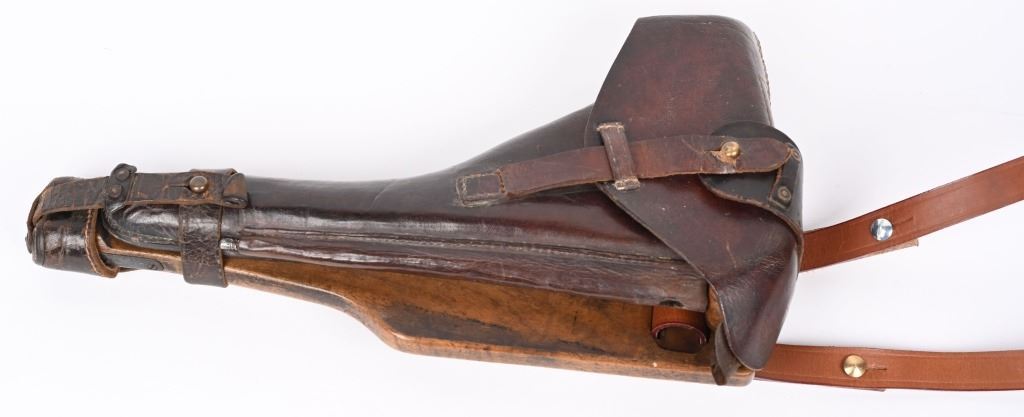 SERIAL NUMBER 8107a BARREL 7 7/8" CALIBER 9MM PARA, MANUFACTURED 1915. Rust blue finished with checkered 2 piece walnut grips. Straw finished trigger, safety, takedown lever and ejector spring. Adjustable front sight with slide adjustable tangent rear sight. Toggle marked DWM in script, Chamber dated 1916. All numbers matching with exception of wood based magazine. Rig includes authentic Imperial marked board stock with attaching iron numbered to another pistol. Attached is leather carry sling bottom leather cup and unmarked holster with cleaning rod. CONDITION. Pistol is very fine with excellent bore and all matching numbers except magazine. Action operates properly Pistol retains over 97% blue finish and 30% straw finish. Board stock is good with iron being patina and wood having numerous small impressions and bruises. Leather holster is very dry and lid is becoming detached from main body of holster. Cleaning rod is very good. Comes with reproduction carry strap and magazine pouch that are fine overall. C&R