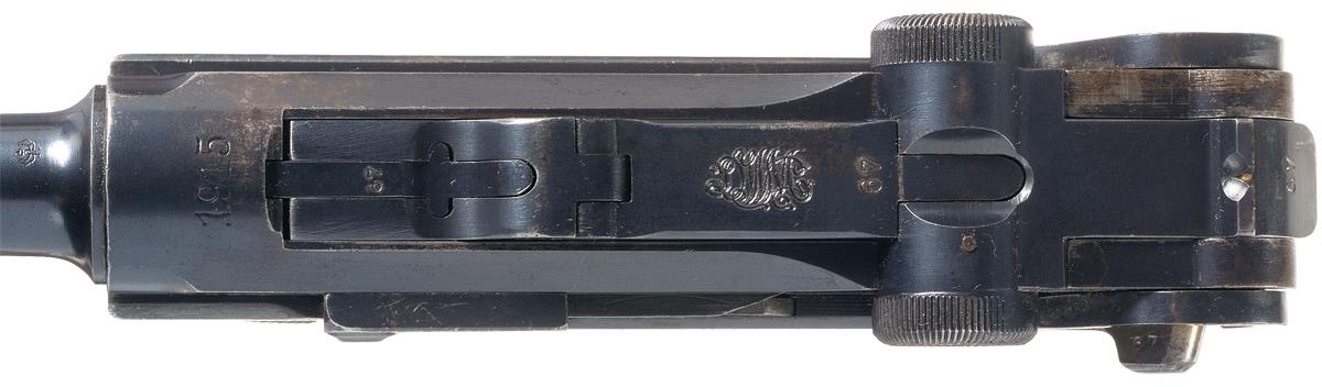 Dated "1915" on the chamber and marked "DWM" on the toggle. The serial number is marked on the left side of the extension, front of the frame and on the bottom of the barrel, with matching partial numbers on the latch, side plate, trigger, sear safety components, hold open, toggle links, extractor, breechblock and firing pin. Bore diameter is marked on the barrel, with the extension marked with three "crown / script letter" and Imperial Eagle proofmarks. The Imperial Eagle proof repeated on the breechblock and barrel. The upper safety position and extractor are marked "GESICHERT" and "GELADEN" respectively. Small components are straw colored and the sear spring and screws are niter blue. Checkered walnut grips.