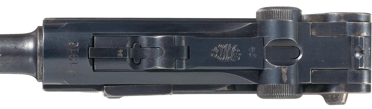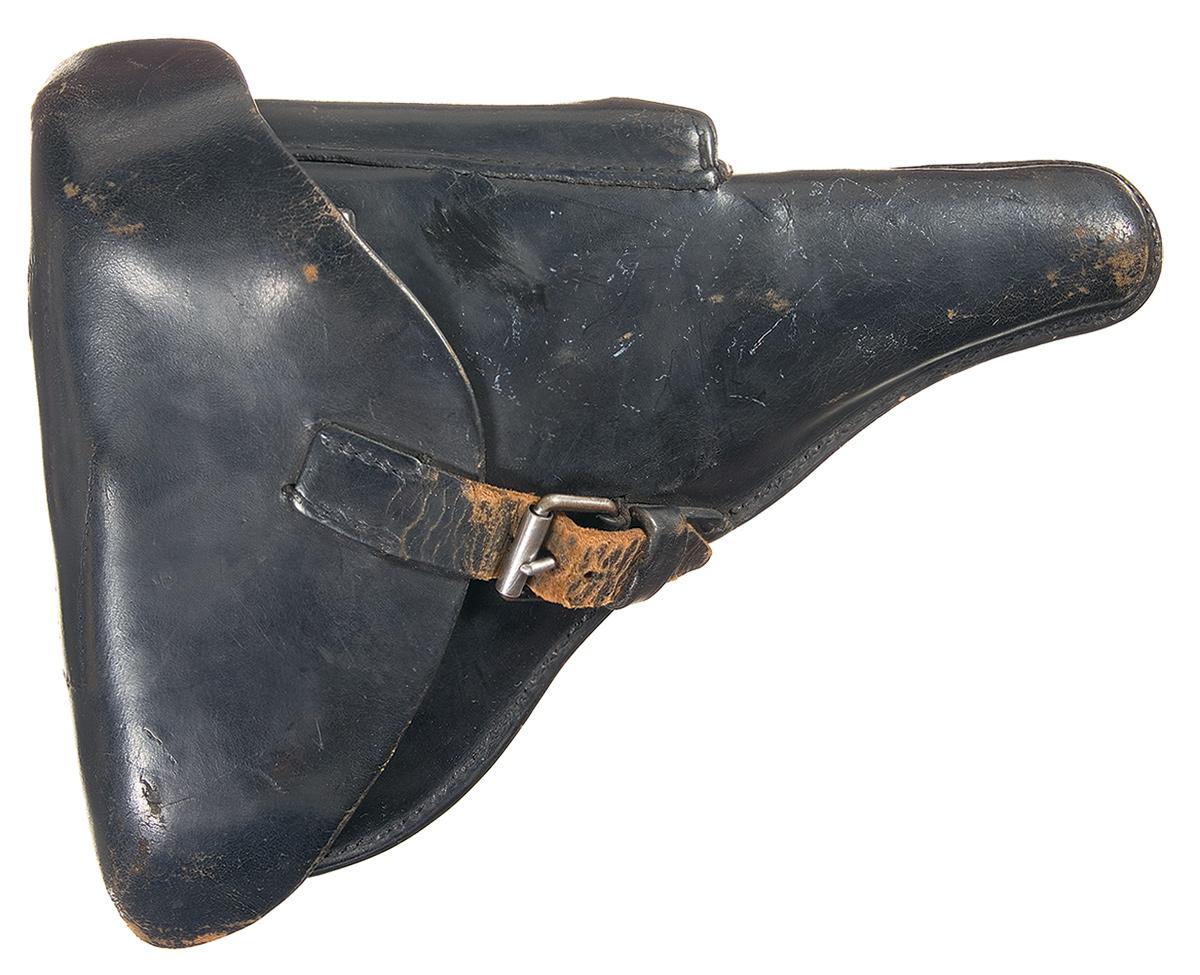 Fixed sights, with the "1916" date on the chamber and "DWM" monogram on the toggle. The right side of the barrel extension has the three Crown over Script proofs next to the Imperial Eagle proof and the left side has the full serial number that matches the frame and barrel. Matching partial numbers on the small parts. The Imperial Eagle proof is also marked on the top, rear of the barrel and left side of the breechblock. Checkered grips, with stock lug on the backstrap. Magazine numbered to another gun. With a black leather flap holster stamped "WaA101" and "AUWAERTER & BUBECK/ A.G./ STUTTGART/ 1934" on the front and an extra magazine.