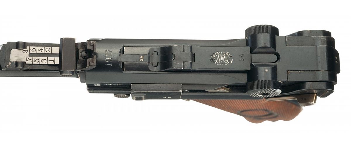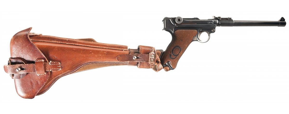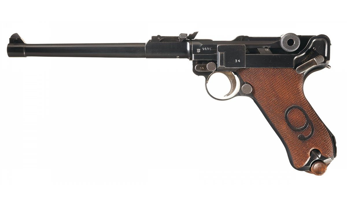 Blade front and tangent rear sights with fine adjustment screws, "1917" date on the chamber and "DWM" monogram on the toggle link. Three "crown/ letter" proofs are present on the right side of the barrel extension, with "Imperial Eagle" firing proofs on the barrel, both sides of the extension, breechblock, and the toggle pin. Excluding the magazine, externally visible numbers match with proper "GESICHERT" and "GELADEN" markings on the upper safety position and extractor respectively. Checkered walnut grips, with a "9" branded on each panel, in the style of the Mauser 9mm Broomhandle. Included with the pistol is a board stock, stamped "4434/b" on the iron, with proper leather straps, a magazine pouch marked "HKO/MUNCHEN/18", and a "HUGO PRETZEL&CO/BERLIN/1916" marked holster with takedown tool, cleaning rod and shoulder strap.
