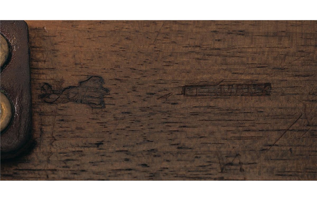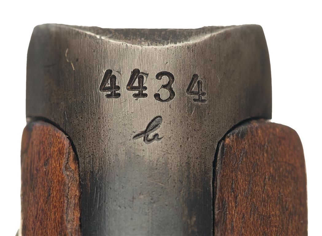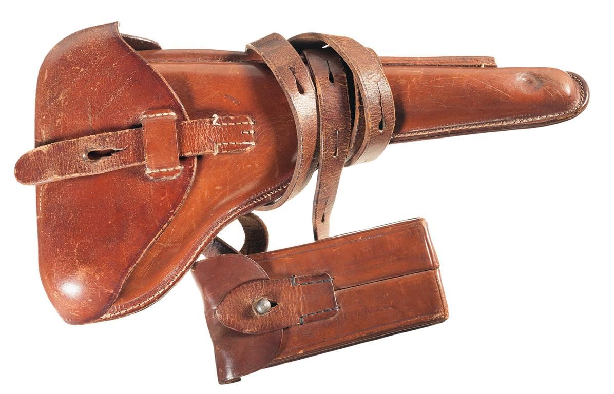 Excellent pistol with 95% plus of the original blue finish, showing areas of gray patina, bright edge wear and scattered spotting overall. Straw colors remain 80% intact. Grips are also excellent, with some minor dings which are concentrated on the right panel. The leather is fine, with cracks and scuffs, and the stock shows mild wear and scratches. The magazine and stock iron are renumbered to match. Mechanically excellent.