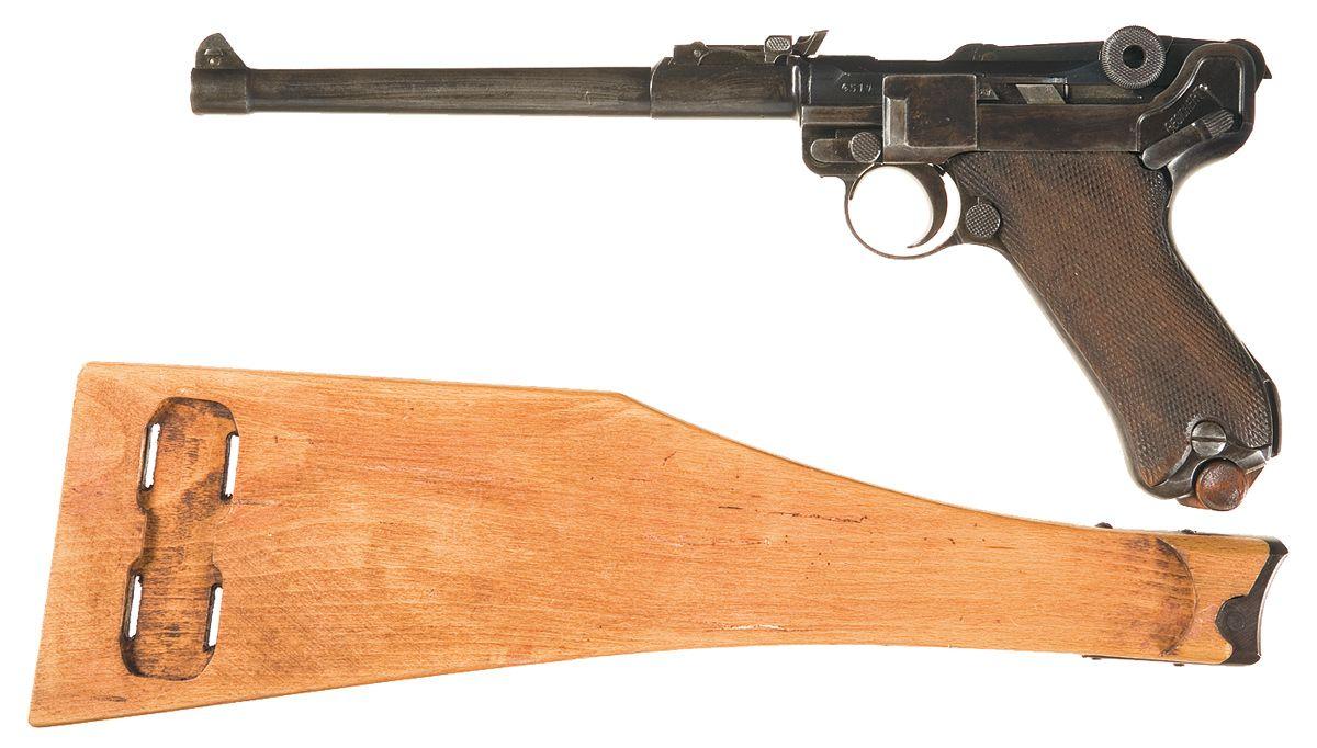Standard sights with fine adjustment screws, matching numbers, checkered grips and a wood based magazine. With an unnumbered reproduction shoulder stock, and attaching iron. Repair of firing pin and retainer needed.