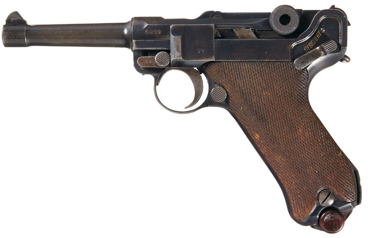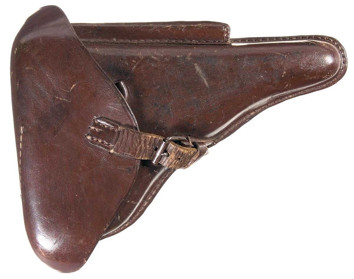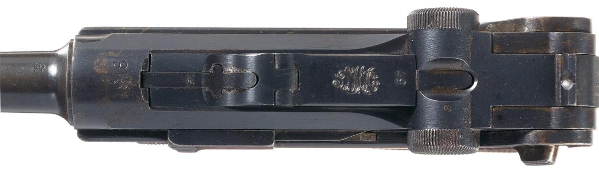 Fixed sights, with "1918" date on the chamber and "DWM" monogram on the toggle. Three "crown/ gothic letter" proofs on the right side of the extension, with Imperial Eagle firing proofs on the extension, barrel and breechblock. Excluding the magazines, numbers are matching. Checkered walnut grips, with a wood base on the nickel finished magazine. Brown leather flap holster, stamped "L.Z.A./ H.Benlin." on the rear and "GUSTAV REINHARDT/ BERLIN/ 1918" on the front, with extra magazine and takedown tool.