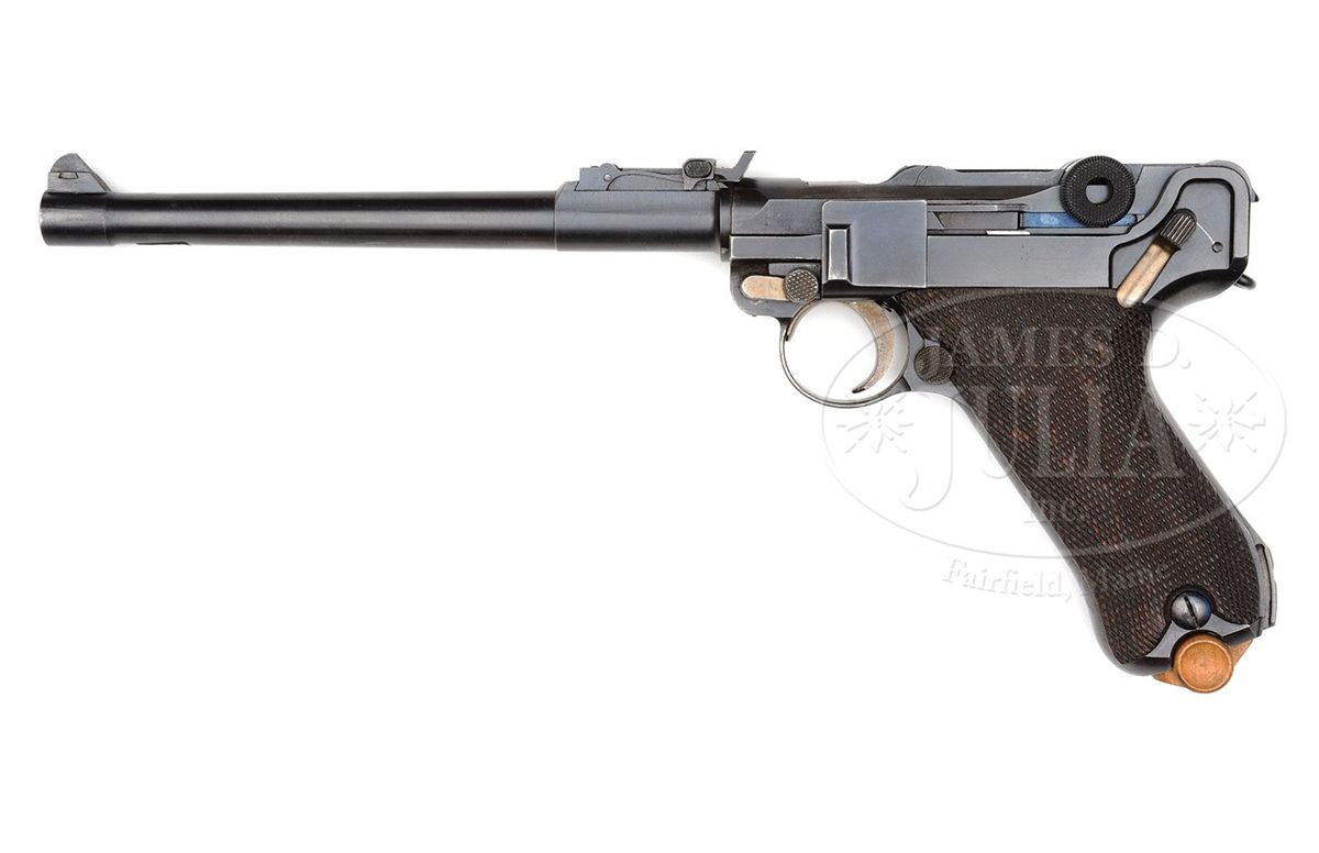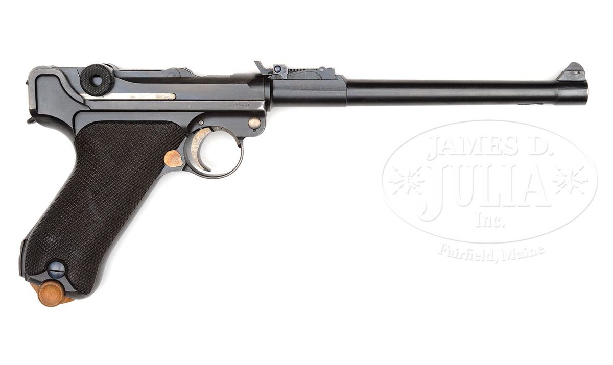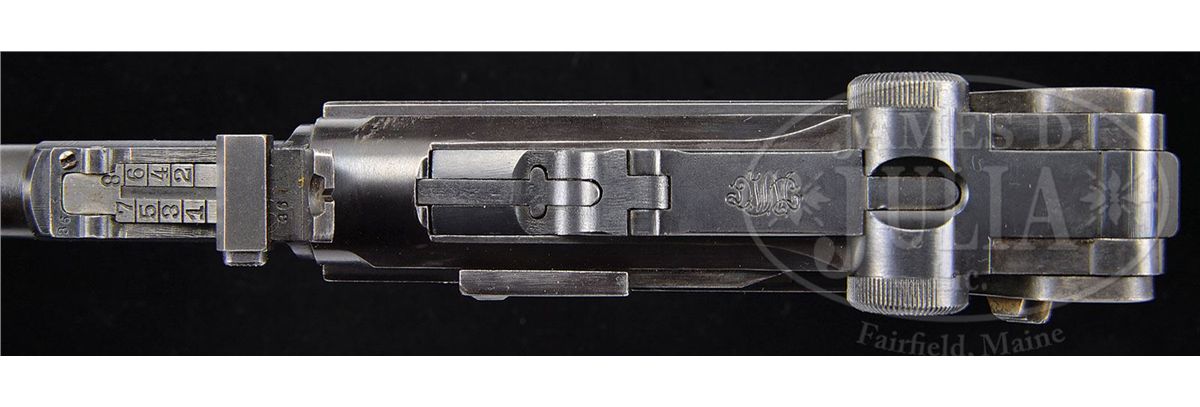 PLEASE NOTE (10-13-13): The catalog correctly states that there is no serial number on the frame. That is exactly how it is and written exactly as it should be. But also please be aware, per the diamond symbol next to the number, it clearly indicates that this item was imported as part of the Sturgess Collection and as such, by Federal Law is required to have an import mark. Import markings require all the pertinent information including the SN. (The import serial number is added to the frame “5A”) The catalog description is correct and the representation is correct. If there are any questions do not hesitate to contact us on this gun. NSN. 8" 9mm bbl with multi-position adjustable rear artillery sight with small parts numbered 36. "DWM" on center toggle link. Checkered walnut grips. Proper "GERMANY" marked wood bottom magazine. Crown/N proofed. Frame is unnumbered. Rear toggle link is #36, sideplate is #97, trigger is #28, and takedown lever is #03. These guns were assembled from leftover parts and are proper without matching numbers. PROVENANCE: Collection of Dr. Geoffrey Sturgess. CONDITION: Excellent retaining 96% original blue and 90% original straw. Bore is bright and sharp. Grips are lightly worn with minor dings and indentations to checkering. Magazine is excellent with a wood bottom that is near perfect. Mechanics are excellent. 4-52797 BWS77